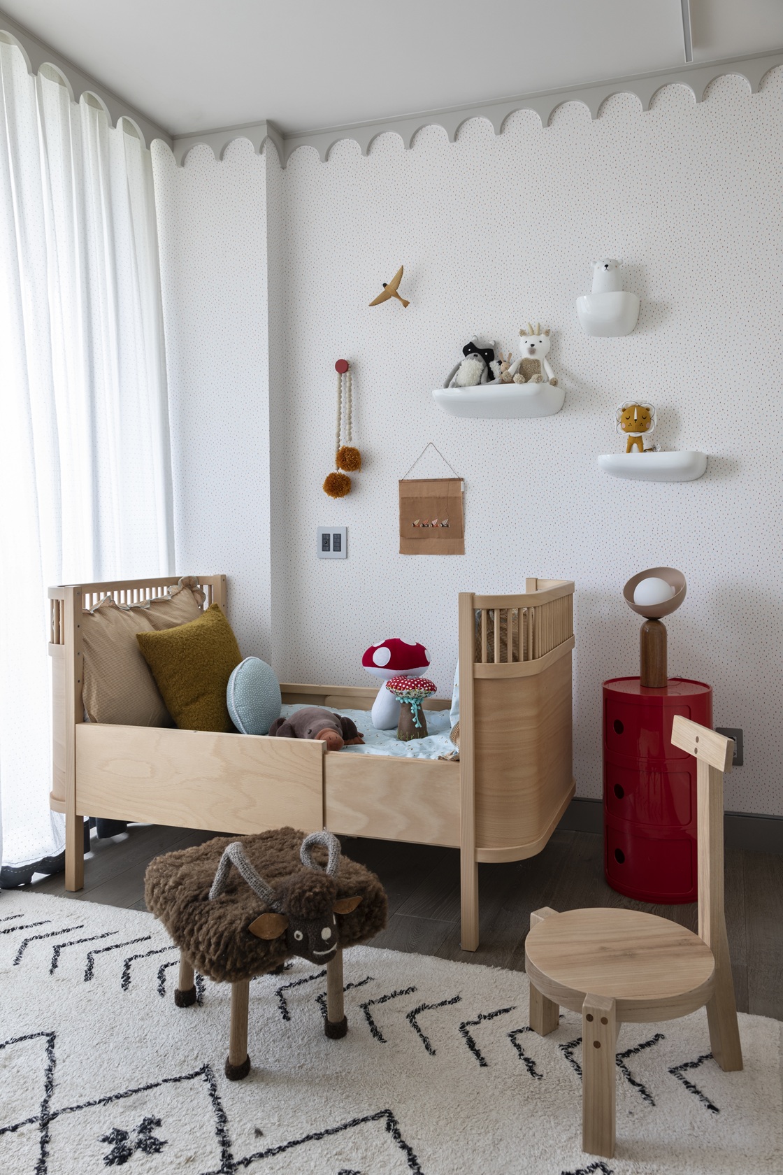 Nos quartos, cada filho ganhou um espaço personalizado para acompanhar seu crescimento. Os ambientes dos meninos são semelhantes, enquanto o quarto da menina se destaca pelo delicado berço Celina Dias Bebê. A suíte master, com seus tons de verde, transforma-se em um refúgio elegante e relaxante.