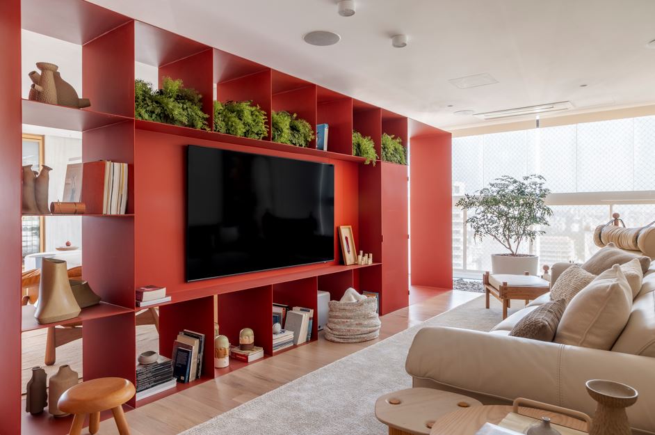 A sala de TV surge como refúgio mais intimista, separada por uma estante em serralheria que filtra os espaços sem bloquear a luz natural. O ambiente combina tecnologia e aconchego, com sofá automatizado e peças icônicas do design brasileiro, como a poltrona de Sérgio Rodrigues, reforçando o diálogo entre conforto e sofisticação.