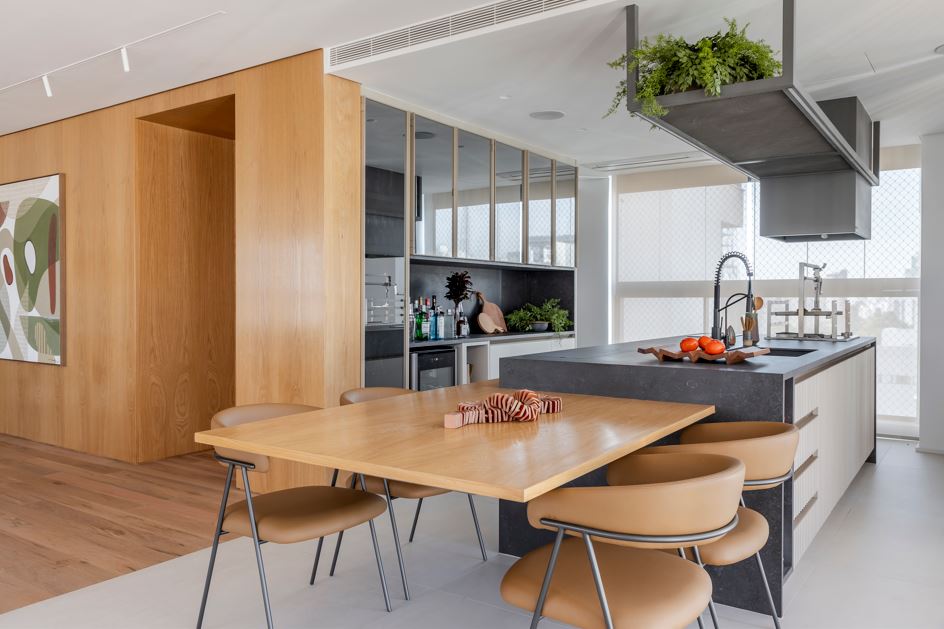 Na área gourmet, a ausência de uma churrasqueira tradicional deu origem a uma solução criativa: um modelo a gás com pedra vulcânica embutido na ilha, que se integra à bancada em superfície ultracompacta de aparência marmorizada. O espaço reúne funcionalidade e estética com recursos como champanheira embutida, cervejeira e marcenaria sob medida, enquanto uma estrutura metálica suspensa acomoda plantas e objetos decorativos com leveza.