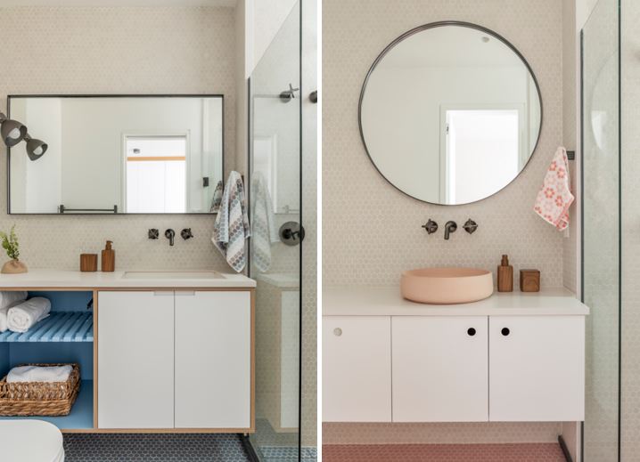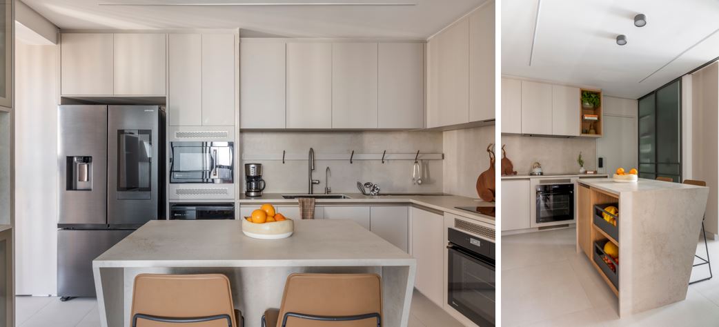 A sala de jantar, instalada na antiga varanda, privilegia a convivência com uma mesa redonda delicada e peças afetivas trazidas de viagens. Já a cozinha passou por uma reconfiguração completa, com layout em “L” e soluções inteligentes que ampliam a funcionalidade, como nichos iluminados e marcenaria que vai do piso ao teto.