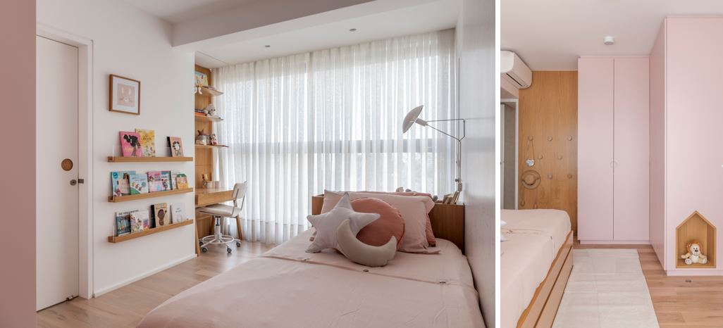 Na área íntima, o projeto equilibra estética e funcionalidade com sensibilidade. A brinquedoteca, instalada na antiga varanda dos quartos, foi pensada como um espaço lúdico e organizado, que estimula a criatividade das crianças. Já os dormitórios infantis seguem uma abordagem montessoriana, incentivando autonomia e aprendizado por meio de soluções acessíveis e personalizadas.