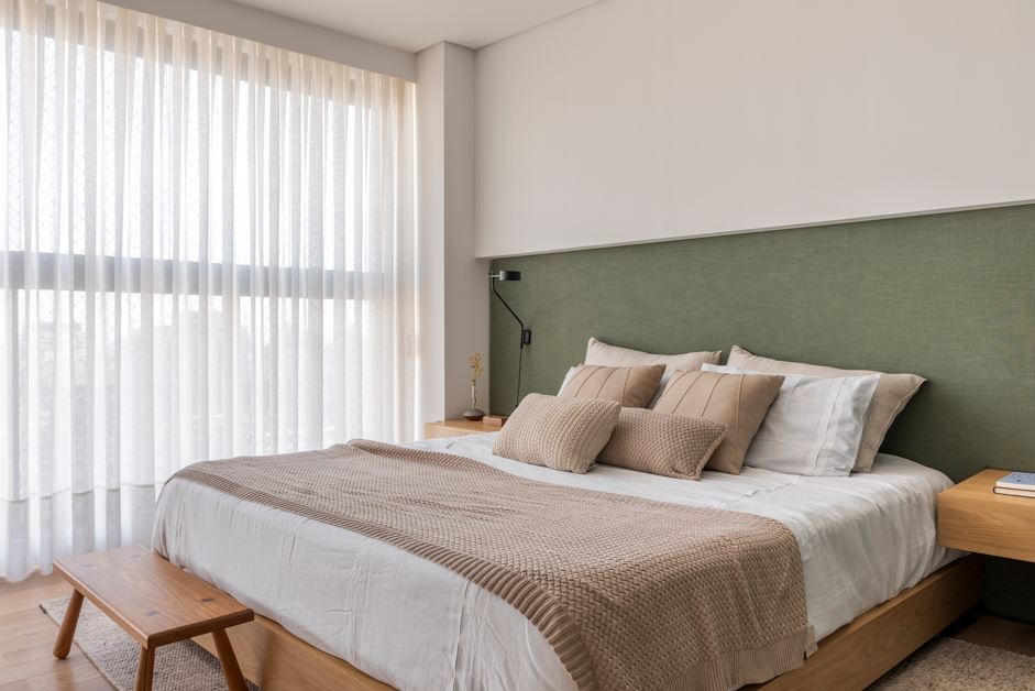 A suíte master traduz o conceito de refúgio com elegância. Com closet independente para o casal, marcenaria em carvalho americano, cama de inspiração japonesa e iluminação cuidadosamente planejada, o ambiente privilegia conforto e bem-estar. Um home office integrado atende às demandas contemporâneas, enquanto o banheiro, ampliado, oferece uma experiência de spa com dois chuveiros de teto, cubas esculpidas e acabamentos sofisticados.