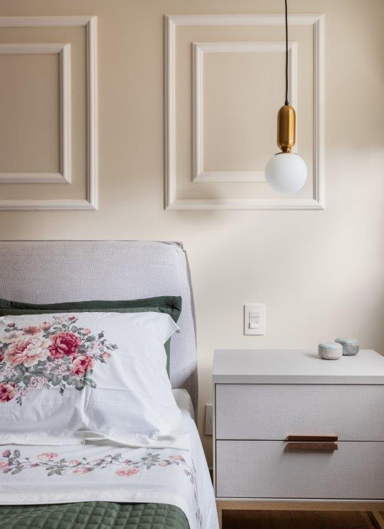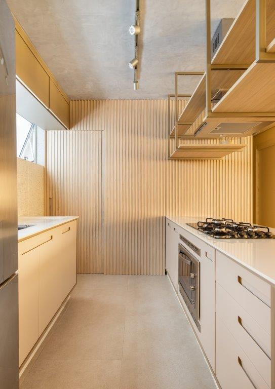 Para equilibrar a mistura de estilos, os arquitetos optaram por uma paleta de cores neutras, utilizando diferentes tons e texturas para criar contrastes e personalidade. No closet e banheiro, por exemplo, o revestimento em “tijolinho” contrasta com o porcelanato, enquanto na cozinha, a bancada de granito preto se destaca dos armários brancos.