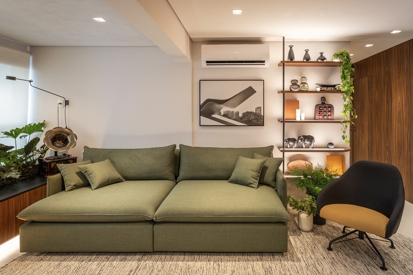 A aposta no contraste entre natureza e concreto, com cores claras e escuras, criou um ambiente sensorial único. “O apartamento é quase uma experiência sensorial. Uma hora você está na sala, com claridade abundante, outra você entra no lavabo, completamente escuro, quase uma caverna intimista”, explica Rafaela Giudice.
