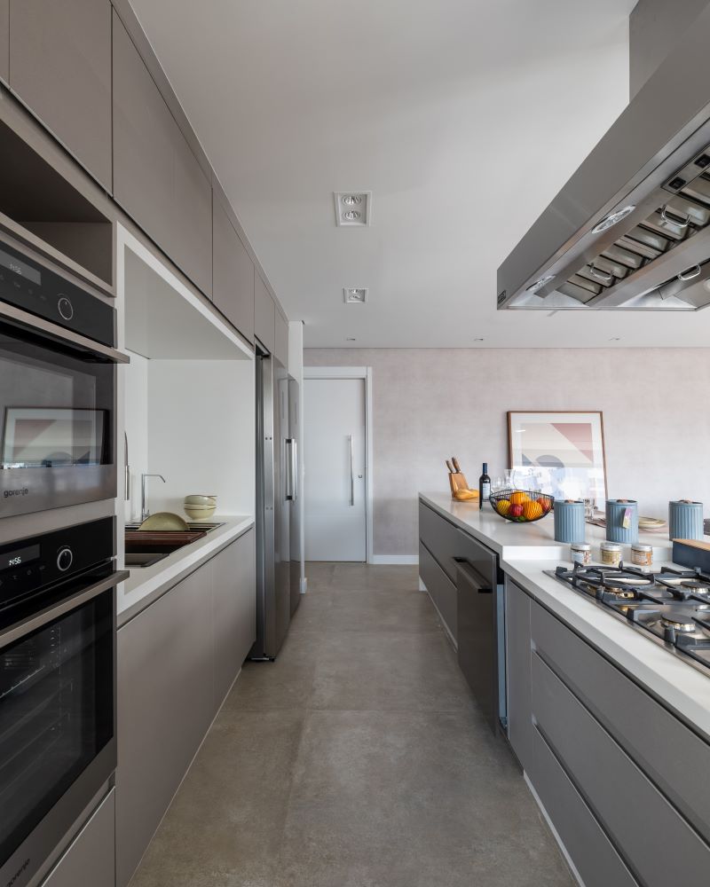 Começando pela grande bancada de quartzo, a cozinha desse apartamento é bastante completa. Cooktop, calha úmida, louças e temperos frescos que a moradora fazia questão de mostrar. “Para ela, cultivá-los no dia a dia é como uma terapia”, relembra Bruno.