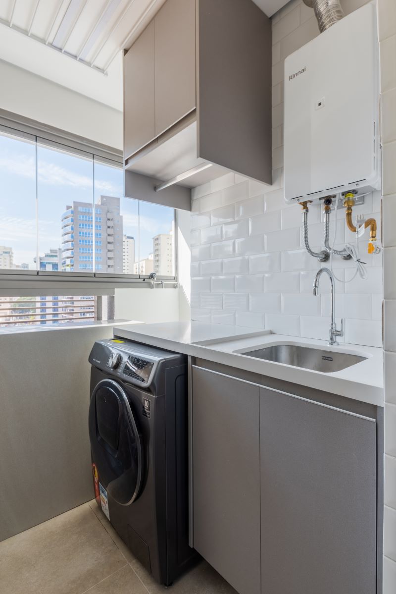 Áreas de serviço são um dos mais desafiadores dentro de um projeto. Neste espaço de 5,5m², o especialista aproveitou cada centímetro e embutiu o tanque de inox na bancada de quartzo branco e, abaixo adicionou a máquina de lavar com abertura frontal.