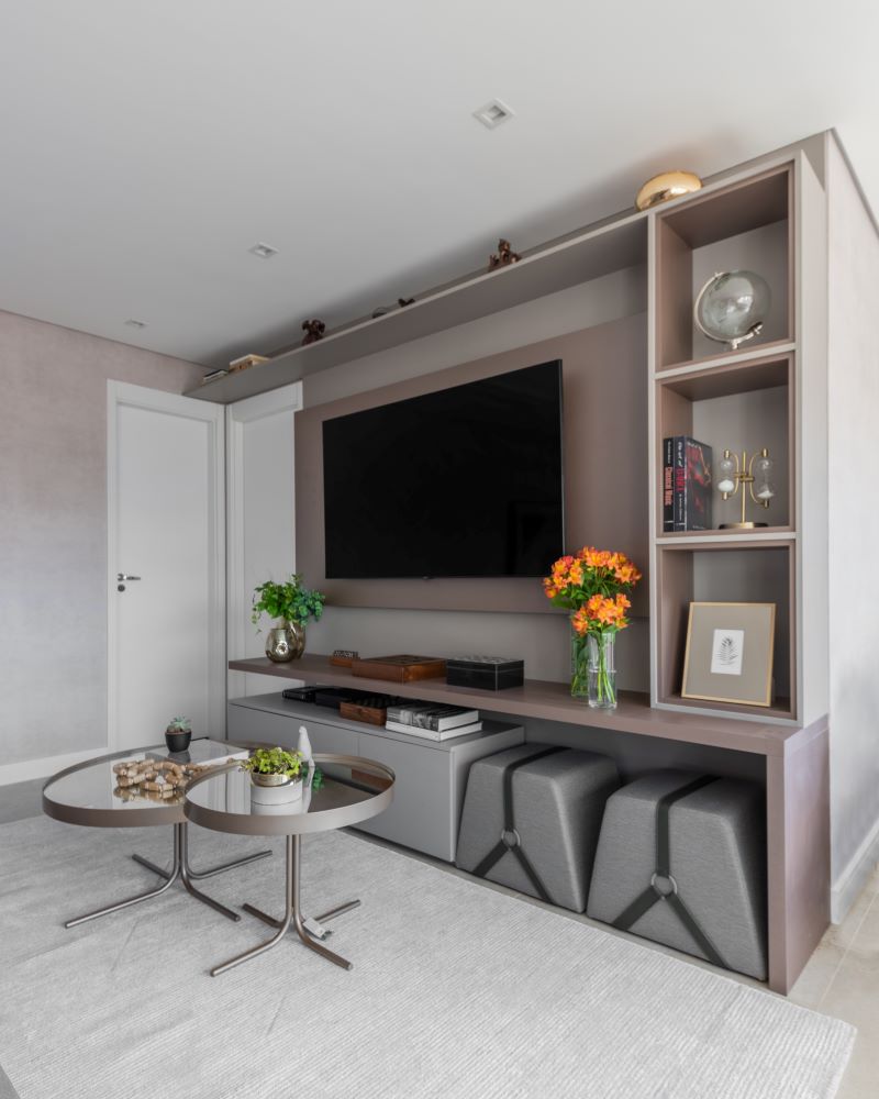 Sala de Estar é sinônimo de fim de semana especial, feriado, recarregar as baterias ou descansar curtindo um bom filme. Para deixar o visual ainda mais leve, a estratégia foi equilibrar as prateleiras, nichos e área fechada onde ficam os aparelhos eletrônicos em um móvel harmônico, que se comunica muito bem com o painel da TV.