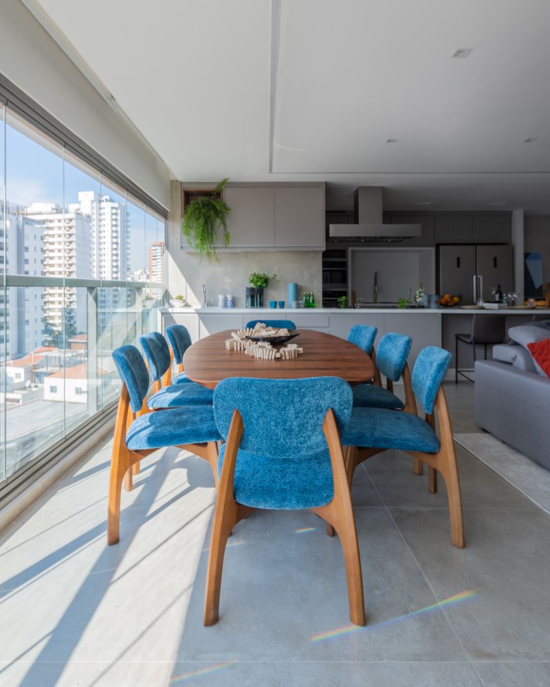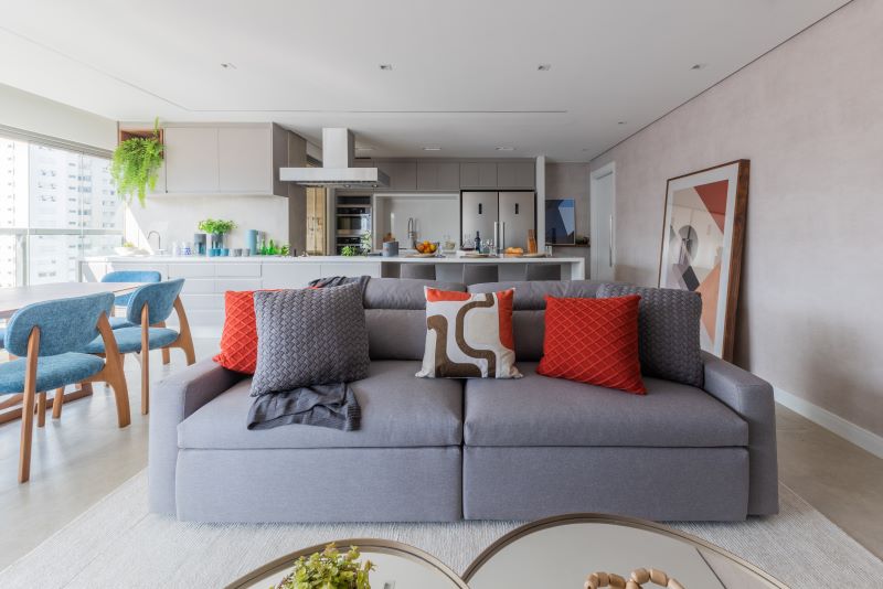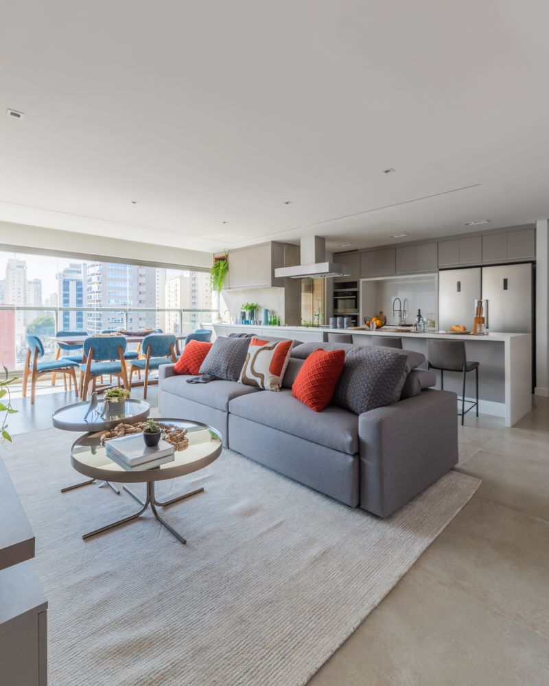 Para espaços integrados como esse, Bruno destaca: “é importante seguir a mesma linguagem e repetir o mood em todos os ambientes com a proposta de mostrar a continuidade da linguagem arquitetônica. Mas se a ideia for demarcar áreas, sem interromper a sensação de amplitude, recorremos sempre ao uso de móveis, tapetes e da iluminação”.