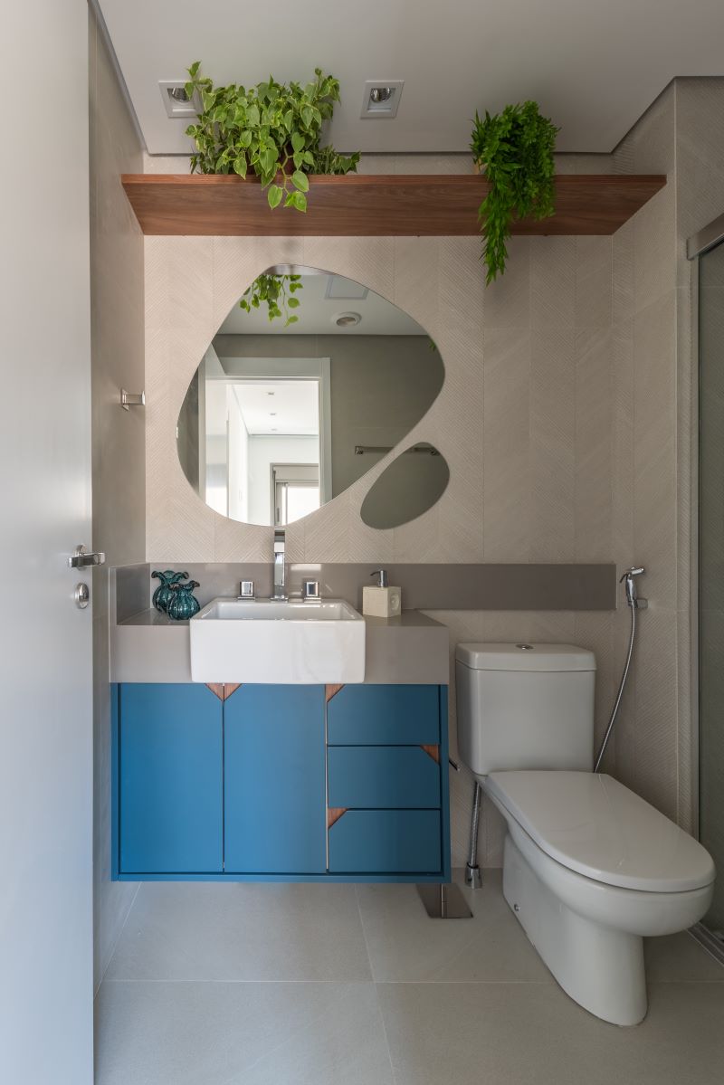 No banheiro do quarto de hóspedes, o arquiteto Bruno Moraes se inspirou na ousadia: sua ideia era tornar o ambiente divertido e com temática jovem. Portanto, ele optou por escolher uma marcenaria na cor azul, que contribuiu para adicionar vida e alegria ao cômodo. Na área do box, revestida com porcelanato, nicho para shampoo e sabonete iluminado por led. Nesse quesito, o arquiteto alerta: “Ao escolher o led, procure por uma versão que tenha proteção contra a água.”