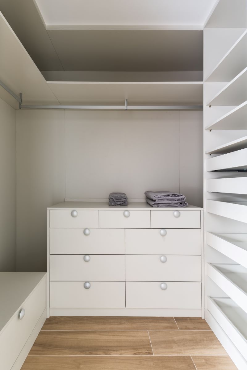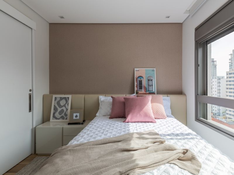 O arquiteto Bruno Moraes apresentou diversas soluções para que a suíte principal se adequasse às necessidades da moradora. Além de adicionar um closet, posicionou a cama mais perto da janela com o intuito de deixar um canto menor de um lado e outro maior do outro. Assim, se no futuro for necessário movimentar uma cadeira de rodas, a circulação ocorrerá sem prejuízos.