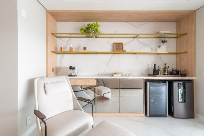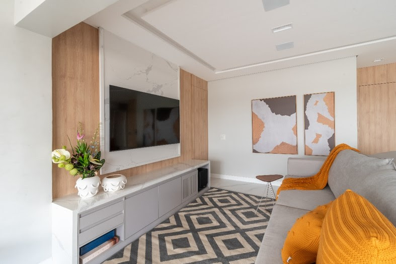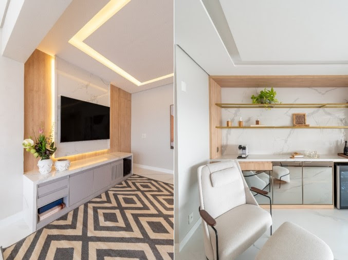 Uma das primeiras intervenções foi a integração da sala com a varanda, ampliando o espaço e proporcionando uma sensação de maior amplitude. A luz natural inunda o ambiente, realçada pelo fechamento de vidro da fachada. A madeira e o mármore, presentes no painel da TV e no home bar, criam um ponto focal elegante e sofisticado.