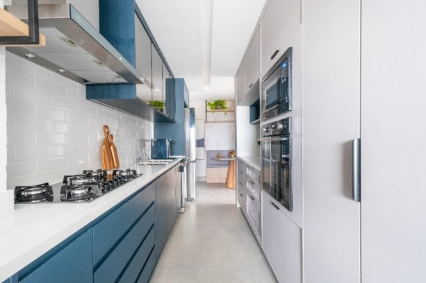 A cozinha é um dos destaques do projeto. A marcenaria azul, em alta no momento, contrasta com o cinza dos demais armários, criando um ambiente moderno e aconchegante. A escolha das cores e materiais evidencia a preocupação em criar um espaço funcional e esteticamente agradável.