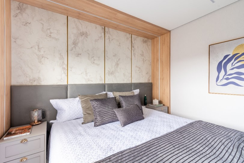 Nos quartos, a arquiteta explorou a combinação de materiais e texturas, criando ambientes personalizados e acolhedores. A cabeceira, por exemplo, é um show à parte, com uma combinação única que reflete a identidade do projeto como um todo.