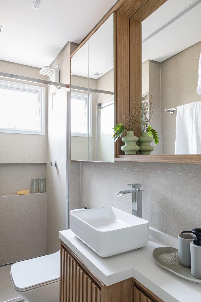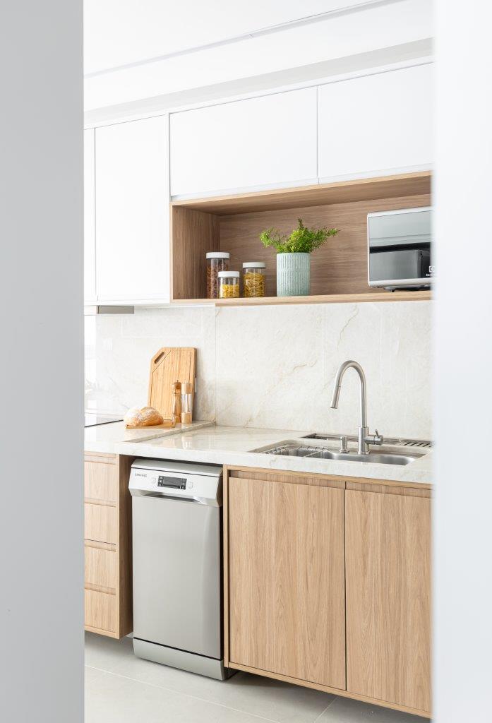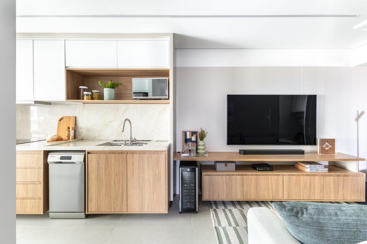 - Marcenaria sob medida: Tons de bege, branco e amadeirado, criando um ambiente clean e moderno.