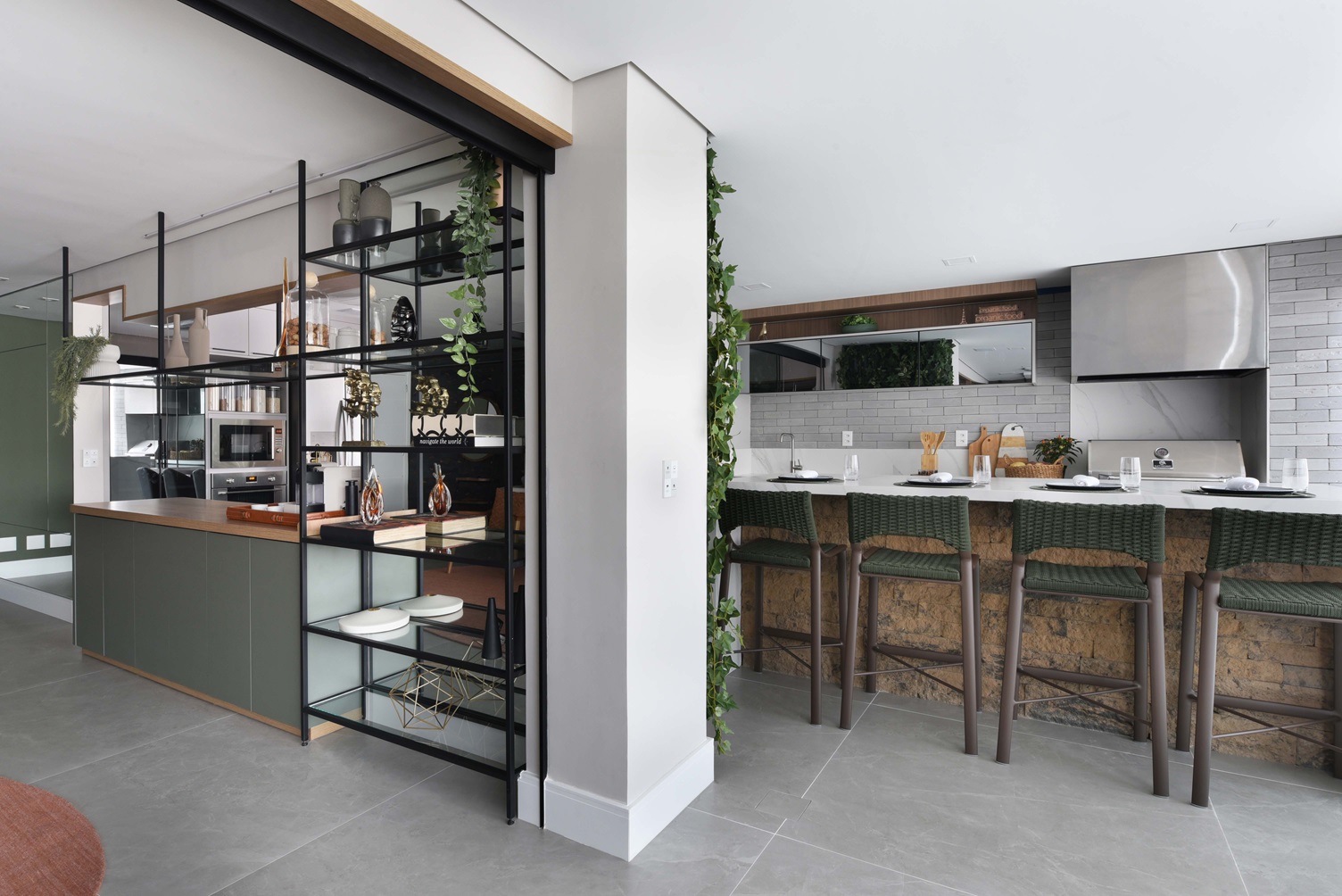 - Estante Divisória: Rosangela Pena utilizou uma estante de serralheria para dividir o living da cozinha, criando um ambiente integrado e com um visual leve e moderno.