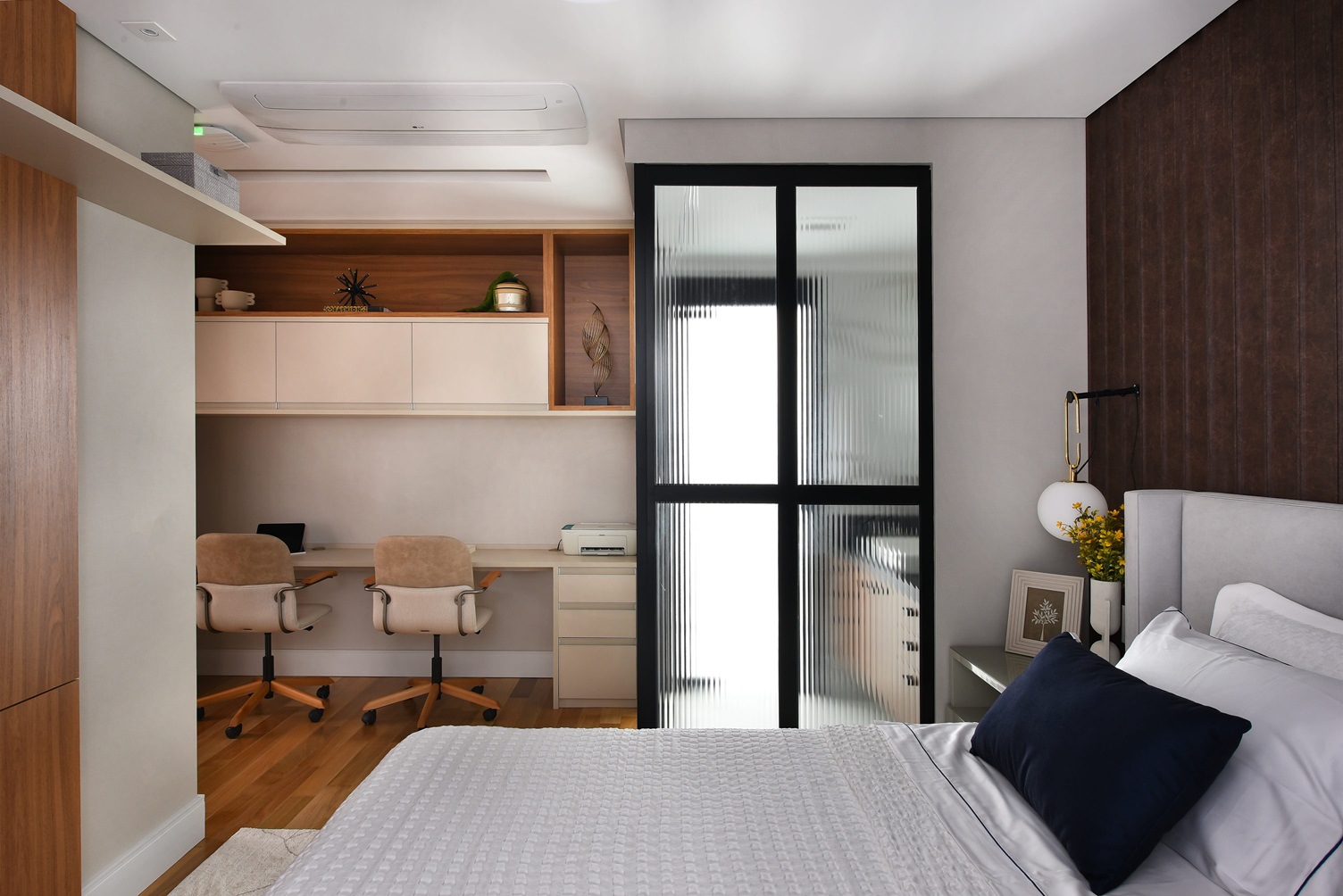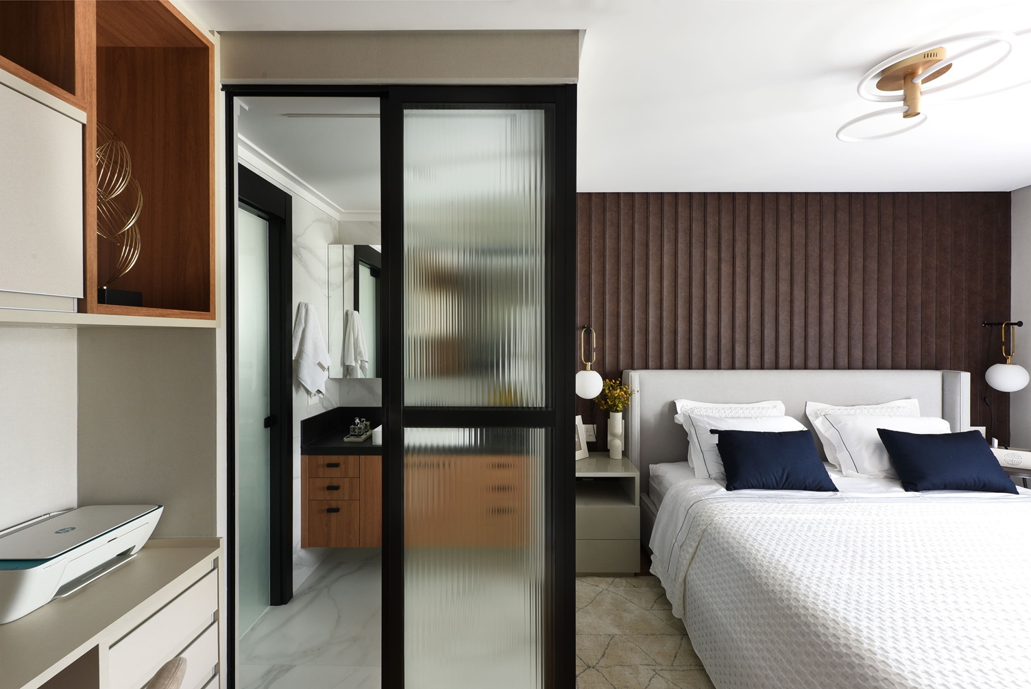 - Esquadria Deslizante: Rosangela Pena optou por uma esquadria de serralheria deslizante com vidro canelado para adicionar personalidade à suíte master.