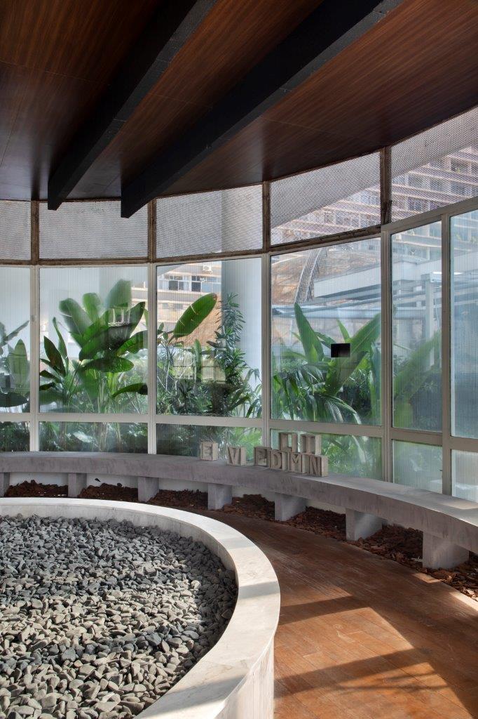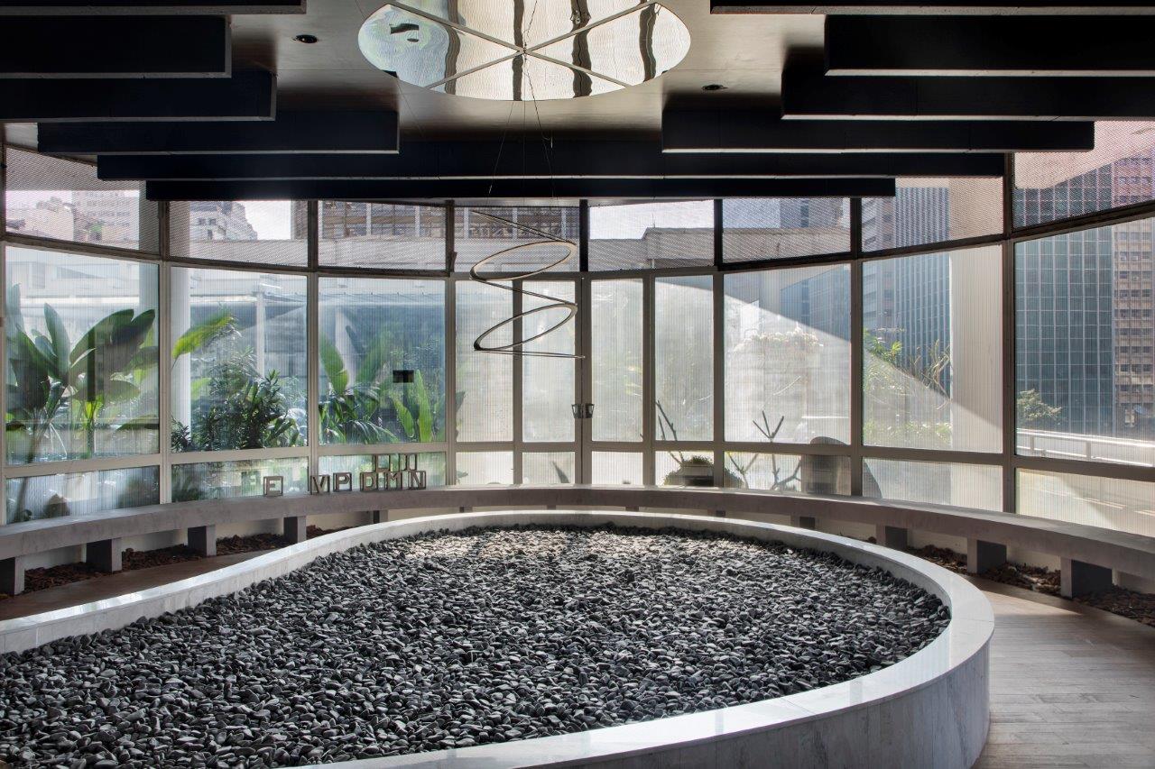 Um piso mais escuro com um jardim zen remete à fluidez dos rios, enquanto uma escultura “Minha Moeda (Vazada)” de Luca Benitez flutua no ar, homenageando o patrocinador e reforçando a temática do tempo. Um espelho no teto propositalmente distorcido convida a questionar a nossa percepção da realidade, enquanto cascas de árvores adornam um grande banco inspirado em uma pista de corrida, criando um contraste entre o natural e o artificial.