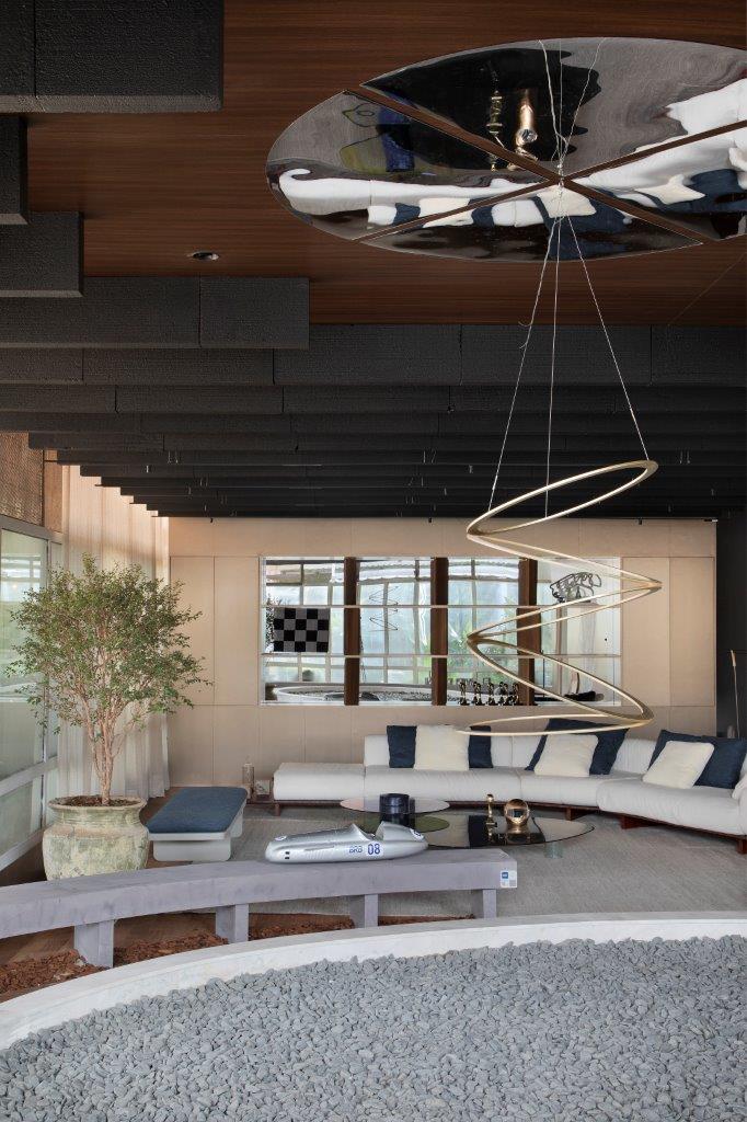 O living, semelhante a um palco teatral, apresenta peças exclusivas desenhadas pelo escritório de Navarro, como o sofá, o banco e as mesas de centro, revelando a autenticidade presente em cada detalhe. A poltrona “Do Lixo ao Luxo”, desenvolvida a partir de um protótipo descartado, é um exemplo da sustentabilidade e do reuso presentes no projeto.