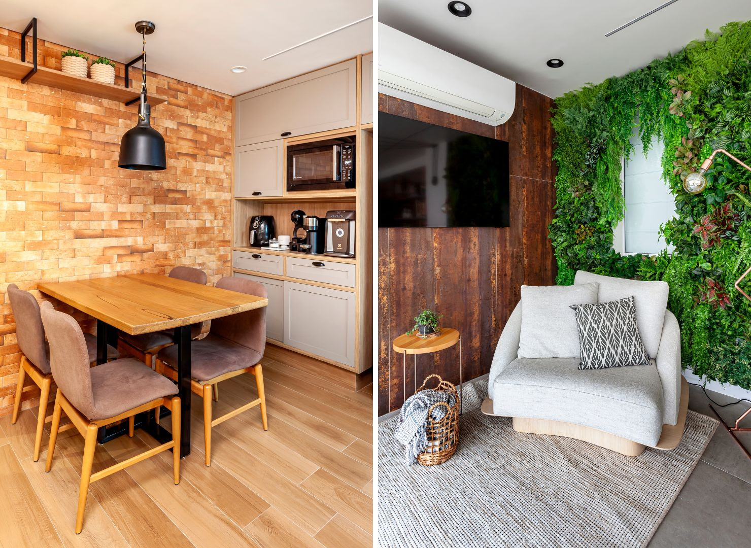 Entre os exemplos assinados pela arquiteta, está a reforma de um apartamento de 140 m² em que o contraste era claro: ela valorizava o rústico, os materiais naturais e o crochê; ele buscava sofisticação e conforto contemporâneo. A solução veio na sala de estar, com uma estante de serralheria que organiza o espaço, dialoga com a varanda e atende às duas linguagens. Portas mimetizadas garantiram unidade visual ao living, enquanto tijolinhos aparentes, jardim vertical e texturas inspiradas no aço corten trouxeram o calor desejado.