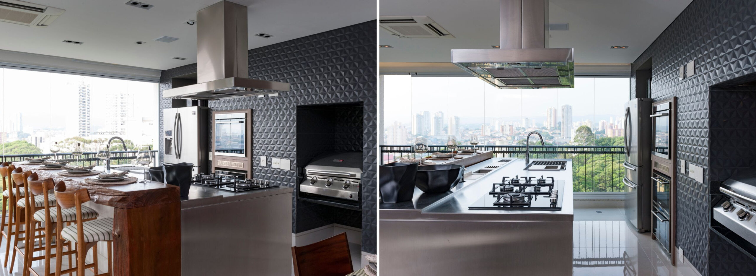 Já em um apartamento de área social integrada, a arquiteta costurou referências do estilo retrô e industrial para um casal de gostos opostos. Metais, cores e texturas aconchegantes foram combinados sem hierarquia, transformando o contraste em identidade. O mesmo raciocínio orientou uma varanda gourmet paulistana, onde inox e madeira bruta se encontram em uma solução híbrida que permite que ambos os moradores se reconheçam no espaço.