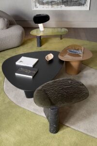 Transposto para nossos dias – mais especificamente para o microcosmo de uma casa que busca se harmonizar com seus moradores, mas também com o planeta -, o ideal alquímico da transmutação se manifesta na coleção por meio de móveis essenciais, mas não menos elaborados. Uma coleção na qual o ineditismo formal cede espaço ao surpreendente: para estofados nos quais o prazer do toque é ressaltado. Para tampos que subitamente migram de um material a outro. Ou ainda para superfícies que parecem estar em estado de fusão.