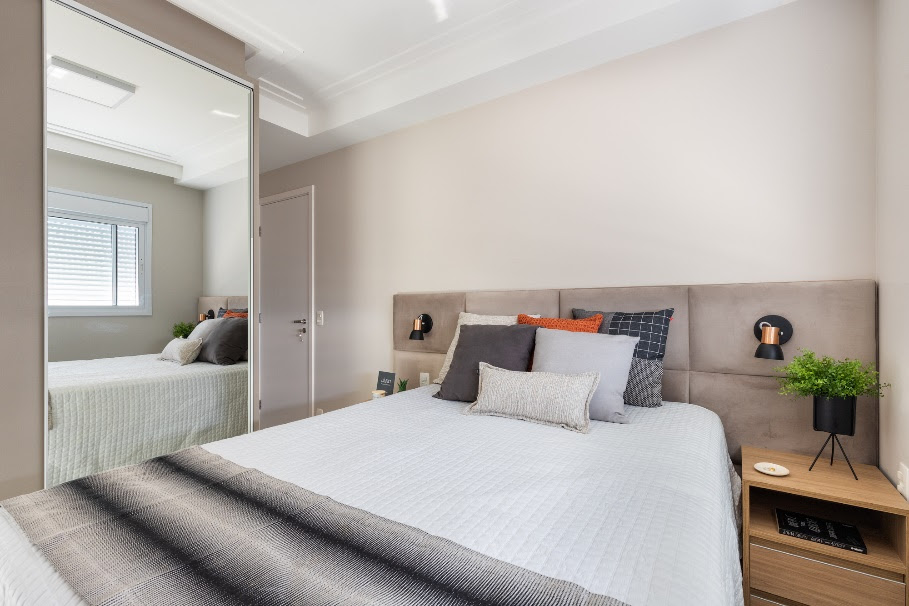 No quarto do casal, a cabeceira estofada e a iluminação embutida criam um clima aconchegante e convidativo. O banheiro da suíte, por sua vez, apresenta um mix de revestimentos e uma paleta de cores neutras, garantindo um ambiente equilibrado e funcional.