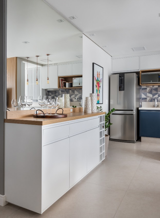 A cozinha, em formato linear, se conecta à área de serviço através de um único tampo, otimizando o espaço e facilitando o dia a dia. Na sala de estar, um painel ripado azul marinho serve como um elegante fundo para a televisão, enquanto um buffet branco com espelho amplifica visualmente o ambiente.