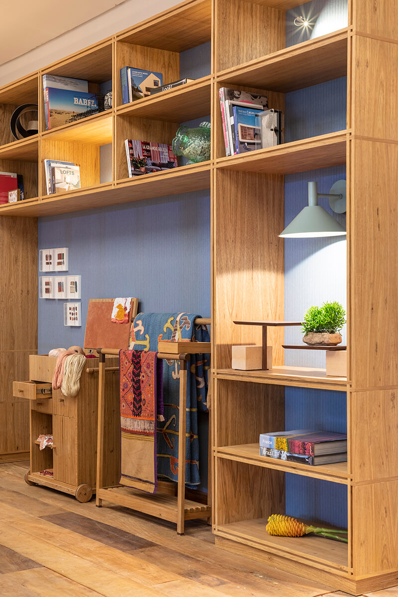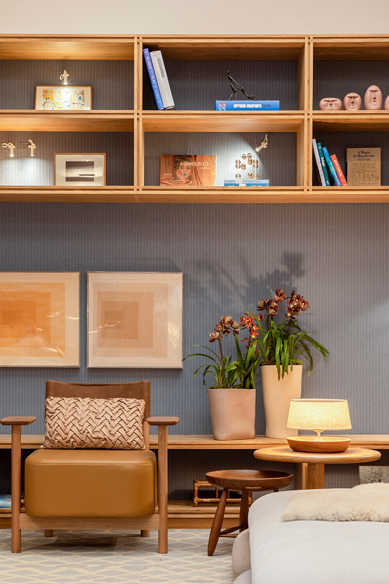 Os mobiliários e as obras de arte garimpadas com todo cuidado e o mix de cores e texturas dos tapetes, reforçam o conceito do espaço. “Fiz esse ambiente pensando em criar algo acolhedor e de descompressão, para o fugir da correria do dia a dia”, entrega Cacau.