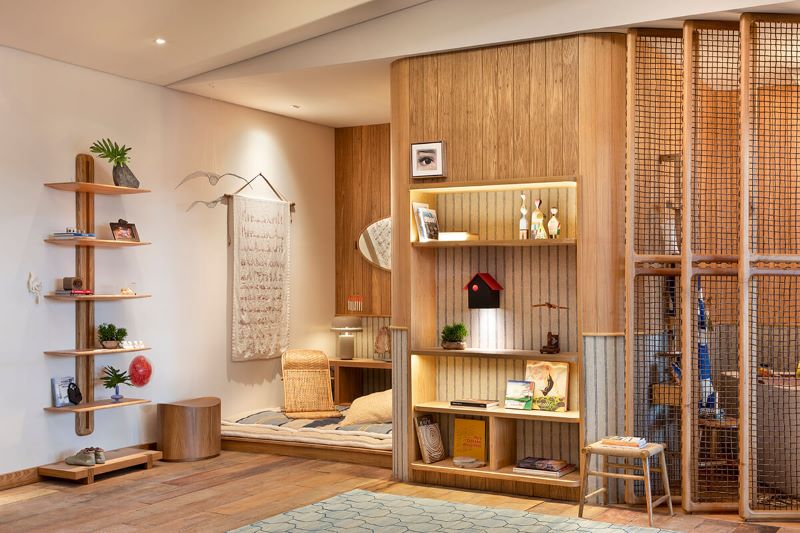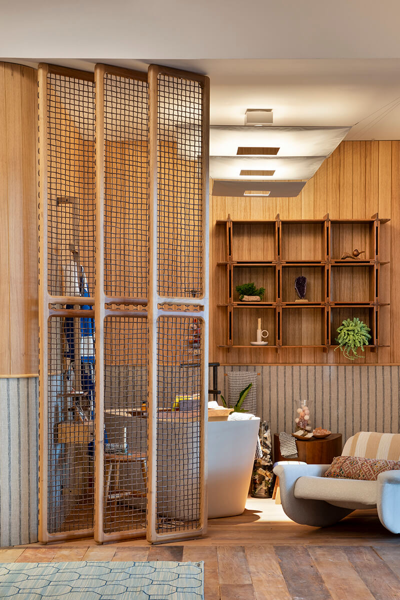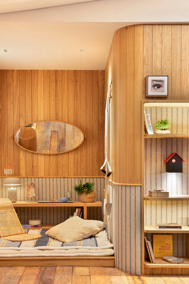 O espaço foi pensado a partir dessa conexão tão relevante entre as esferas da vida, daí a proposta de um canto de tecelagem, meditação/yoga e spa, integrados a um living confortável.