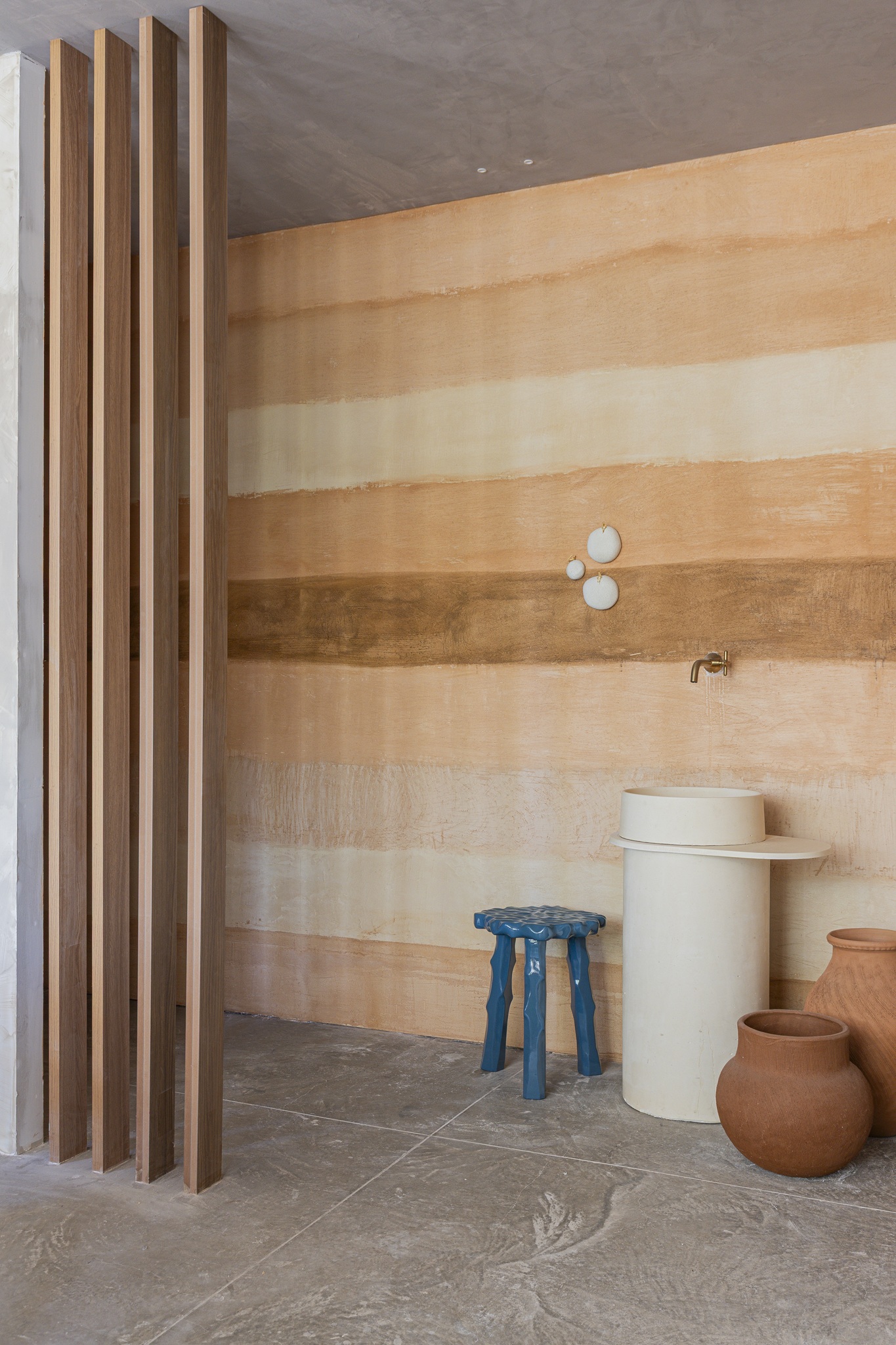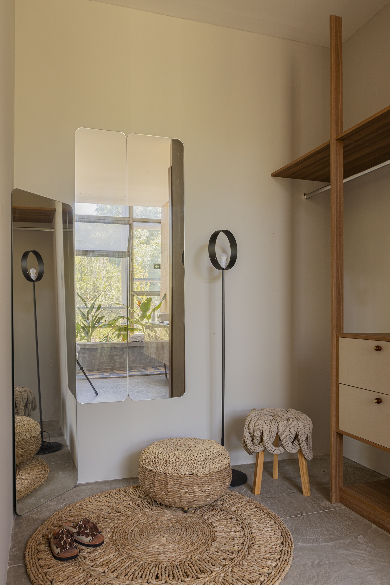 Além da estética, a casa aposta em soluções bioclimáticas, como ventilação cruzada, sombreamento e uso de materiais naturais, promovendo conforto térmico e sustentabilidade. A curadoria de acabamentos valoriza a produção regional, com cerâmicas artesanais, madeira e fibras naturais que dialogam com o território.