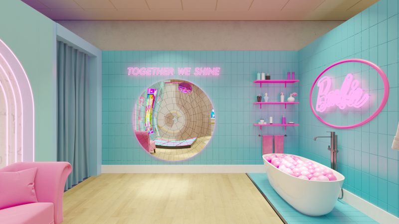Acompanhando o lançamento mais aguardado das férias de Julho, o filme da Barbie (claro!), mostra instagramável é uma espécie de casa cor, Barbie Dreamhouse Experience tem ambientes para fotos e selfies e banheira de bolinhas.