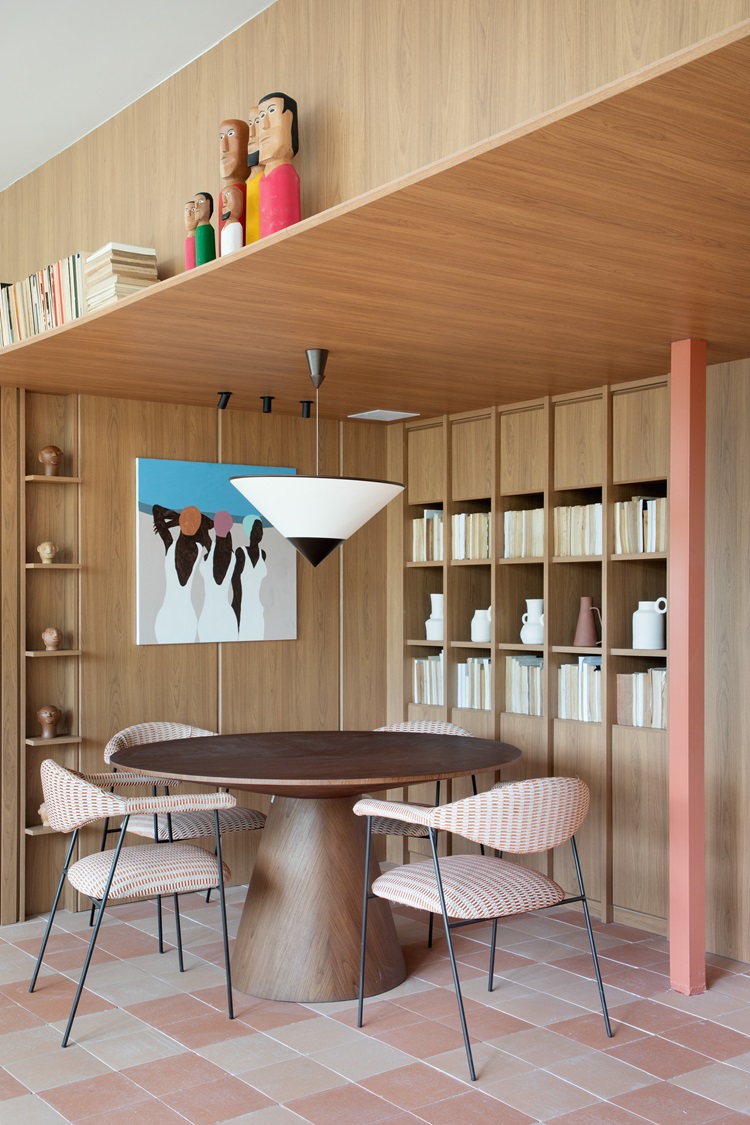 A marcenaria, um dos destaques do projeto, utiliza o padrão Freijó da Criare. Este elemento é crucial para harmonizar os diferentes níveis do ambiente, revestindo teto e paredes, além de compor armários e estantes que conferem aconchego.
