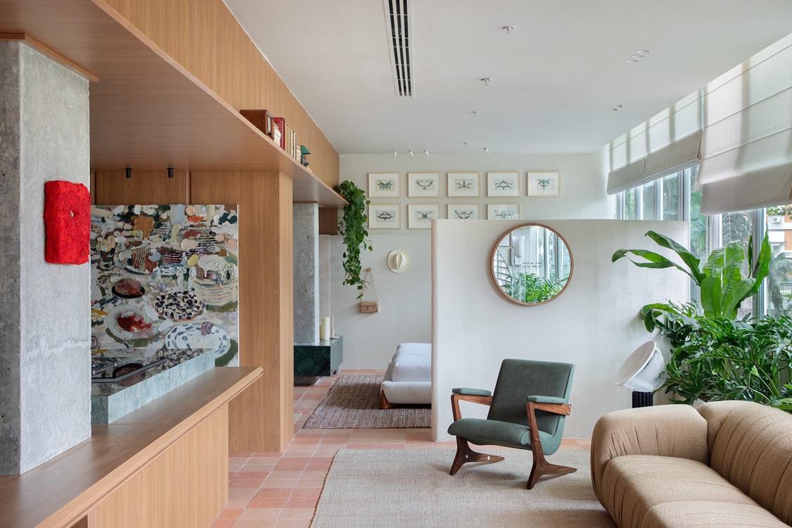 Móveis contemporâneos da Novo Ambiente, como o sofá Chapada de Roberta Banqueri e a poltrona Zeca de Zanine Caldas, complementam o espaço, que ainda conta com tapetes naturais paquistaneses da Galeria Haith.