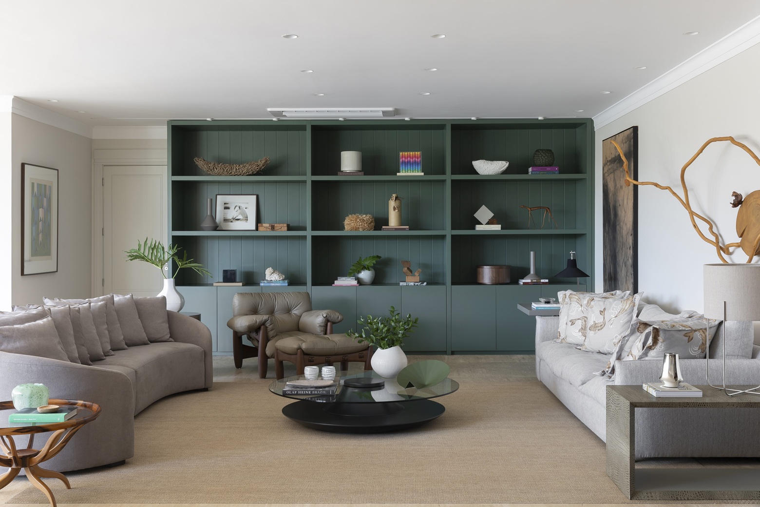 A decoração celebra o melhor do design brasileiro. No living, o sofá e as poltronas Artefacto dialogam com a icônica mesa Água, de Domingos Tótora, que imprime leveza orgânica ao ambiente. Os tapetes da By Kamy agregam conforto e texturas, enquanto obras de Rubem Valentim, Alfredo Volpi, Marcelo Maimone e peças garimpadas contam a história da família. O destaque visual é a estante verde sob medida, criada para abrigar esculturas, livros, arte e memórias afetivas — acompanhada da informal e irresistível Poltrona Mole, de Sergio Rodrigues, que reforça a brasilidade chique do projeto.