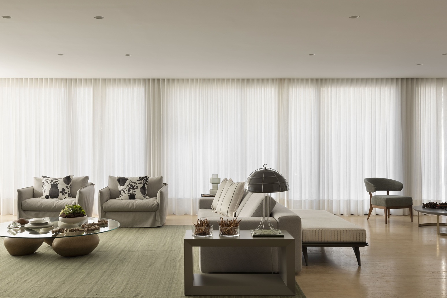 No mesmo andar, uma sala íntima de TV com copa de apoio e lavanderia privativa reforça a funcionalidade e a privacidade. Já no térreo, o projeto ganha seu ponto alto: integração total. Living, salas de estar, jantar, TV e espaço gourmet formam uma área social fluida, com aberturas generosas para o jardim assinado por Mônica Costa, que traz a natureza para dentro através do aroma de lavandas, camélias e alecrins.