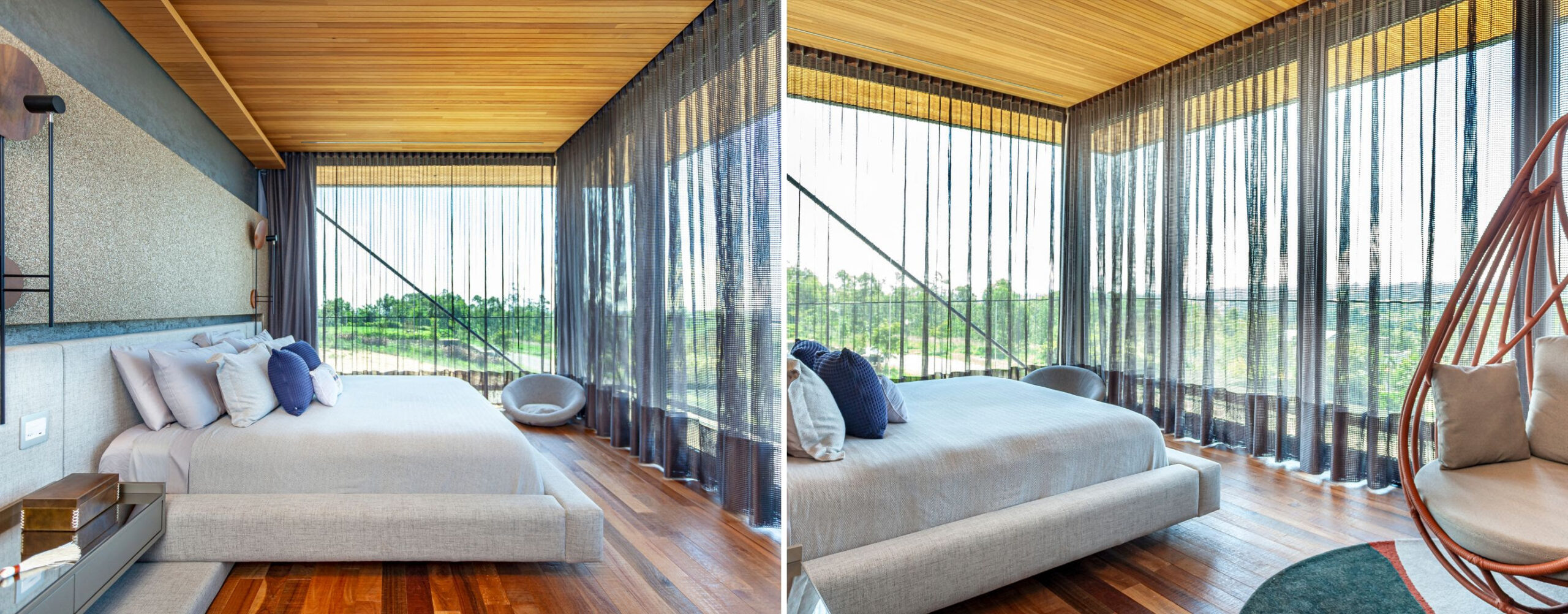 No pavimento superior, a rotina da família é valorizada com academia panorâmica, sala íntima com cantinho do café e frigobar embutido. A suíte master conecta-se à paisagem por amplos fechamentos de vidro e um balanço suspenso que convida ao ócio criativo. Banheira freestanding e closet generoso completam o conforto do casal.