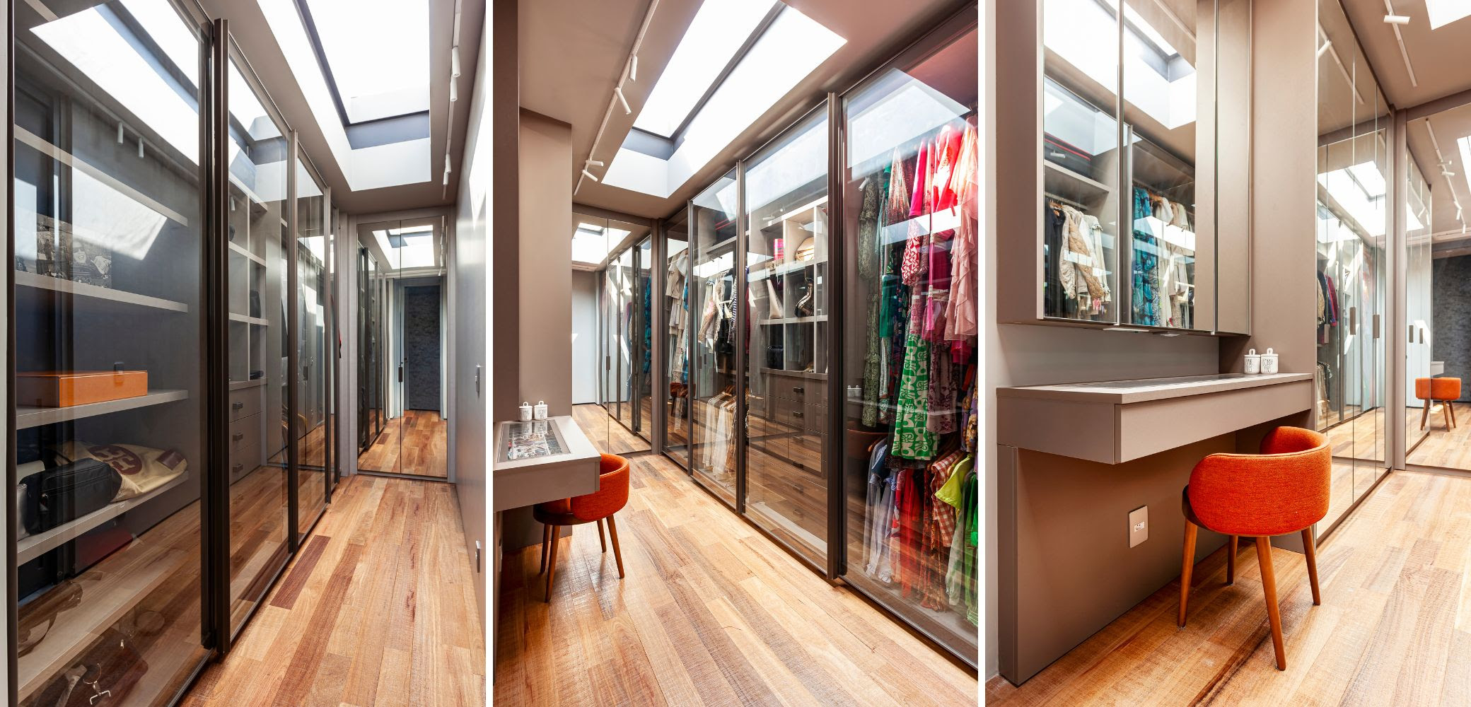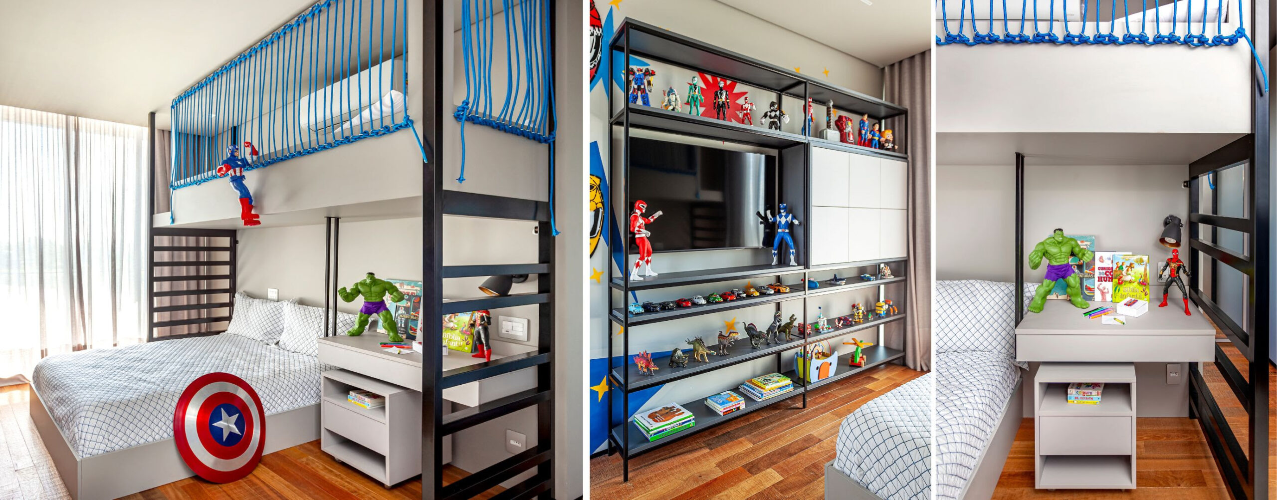 Os quartos dos filhos também foram pensados para crescer junto com eles. O primogênito ganha um ambiente temático do Corinthians, com escrivaninha multifuncional e espaço para LEGO, action figures e videogame. O caçula, por sua vez, tem cama suspensa protegida por cordas de segurança, traduzindo aventura e aconchego.