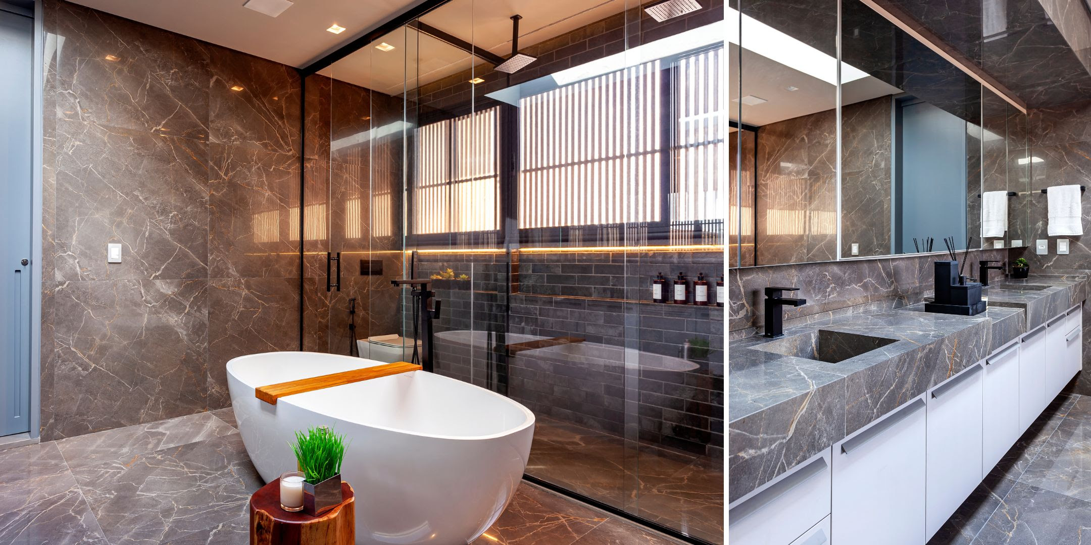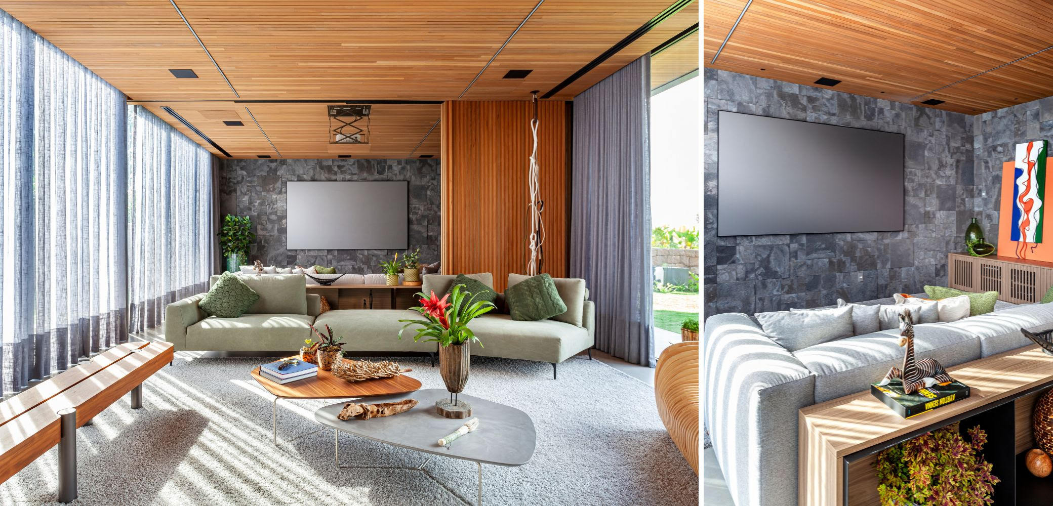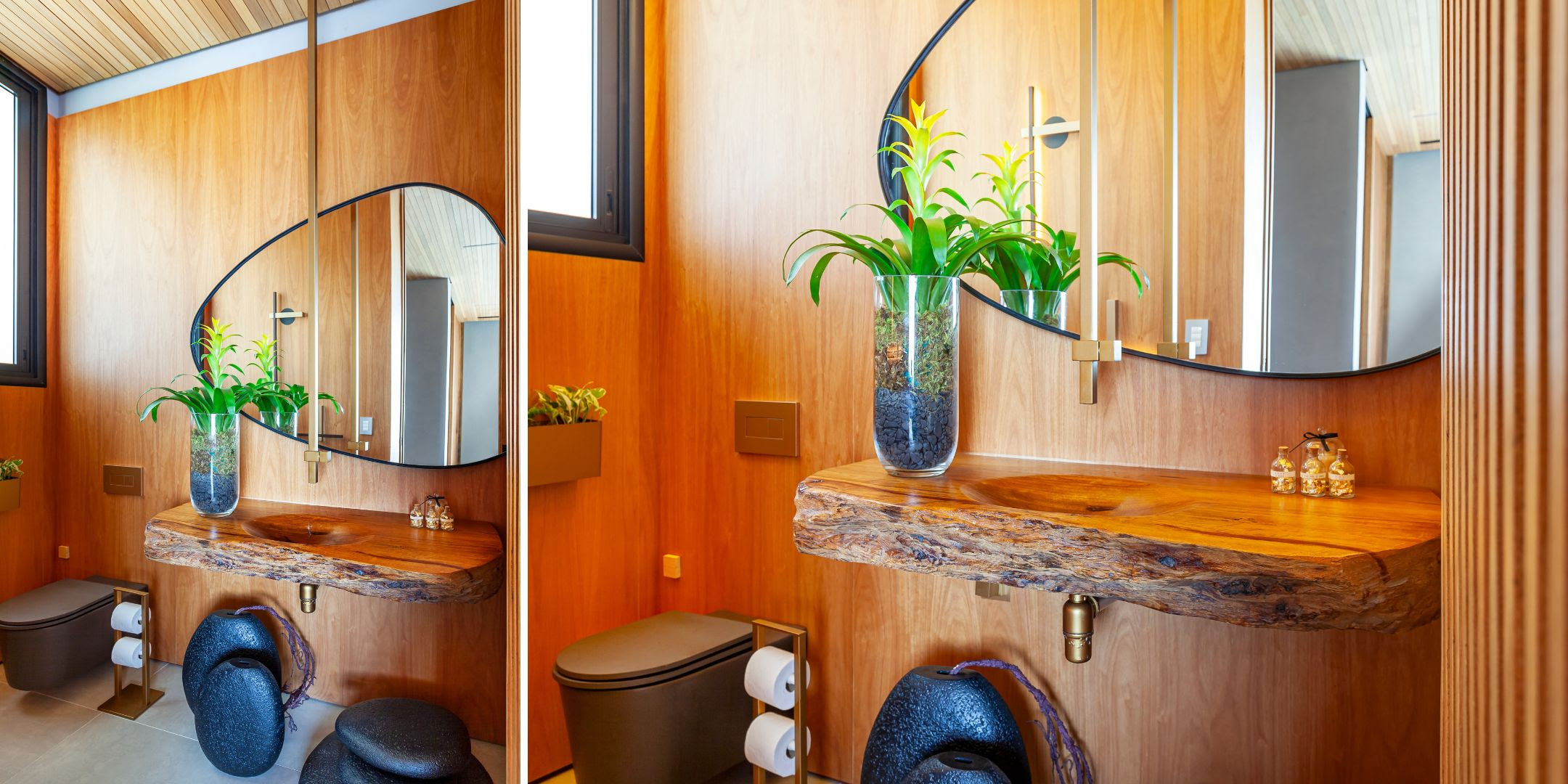 No lavabo, materiais surpreendem: bancada esculpida em tronco maciço, torneira suspensa que desce do teto e espelho orgânico compõem um cenário único. Já o home theater, fechado por portas de correr, oferece experiência de cinema em casa sem abrir mão da estética — projetor retrátil embutido, caixas de som no forro e revestimentos cimentícios garantem conforto acústico e visual.