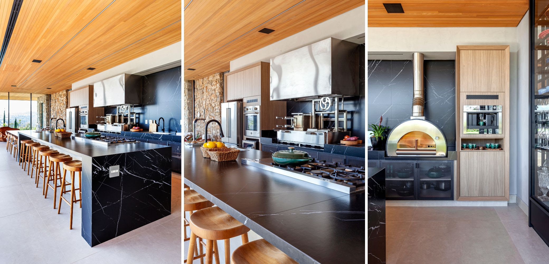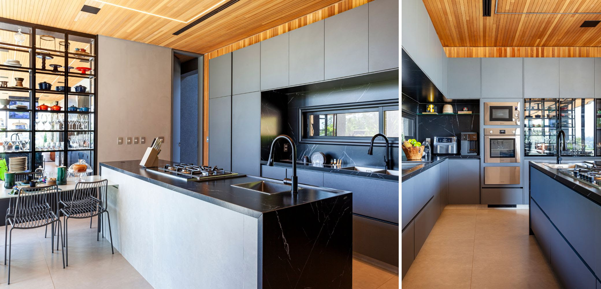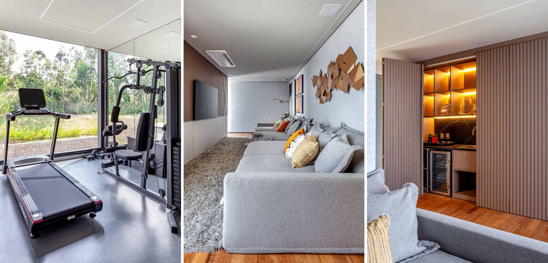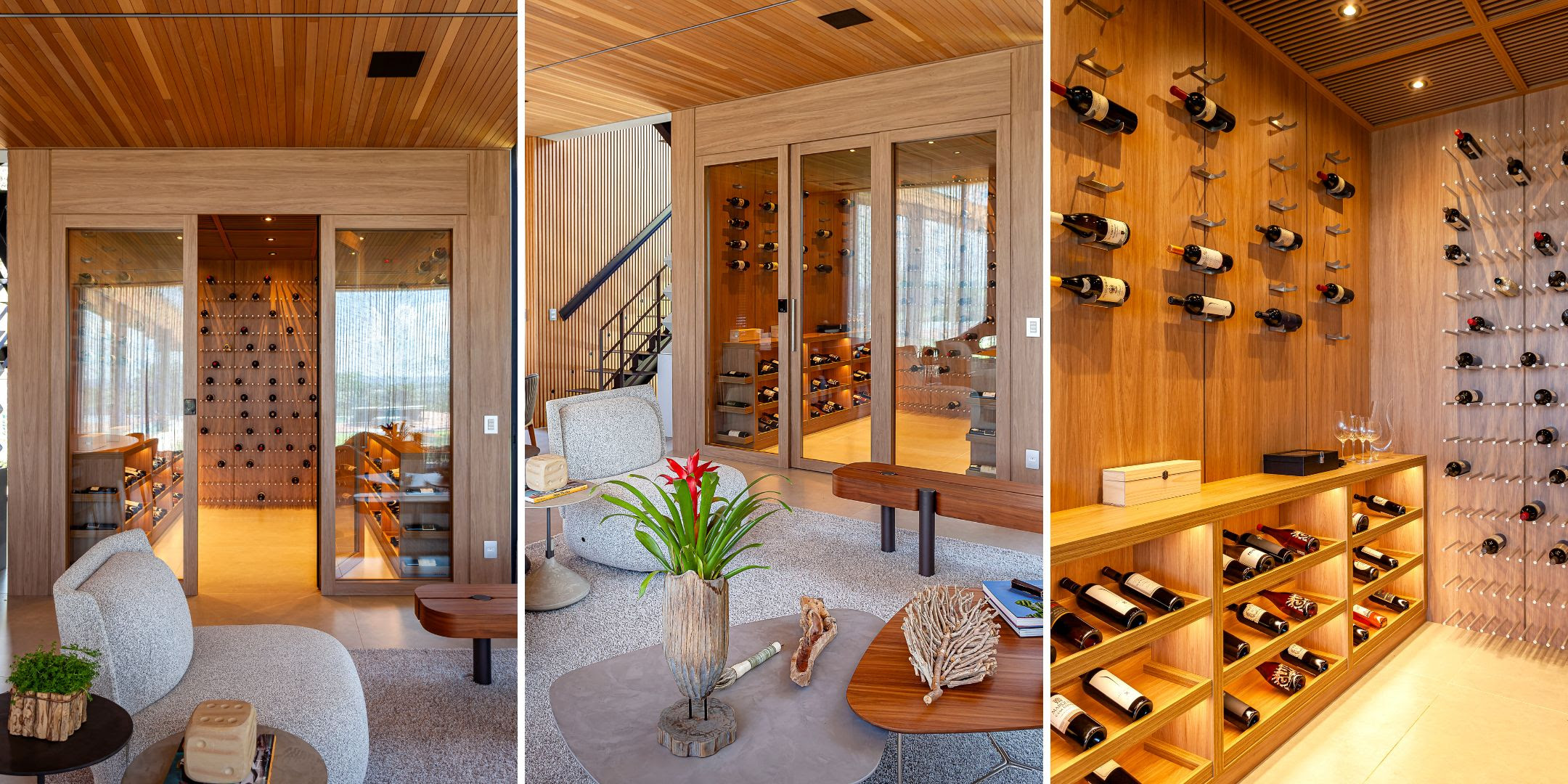 A casa foi planejada para um casal com dois filhos, de 10 e 6 anos, com foco no convívio familiar e no prazer de receber amigos. A integração entre living e sala de jantar revela um ambiente acolhedor, onde painéis ripados de madeira camuflam portas e criam continuidade visual até o home theater. O espaço ganha charme com uma adega envidraçada, climatizada em parceria com a Art des Caves, que se torna ponto de encontro para os apreciadores de vinhos.