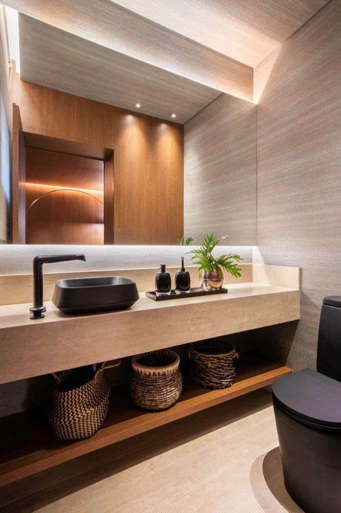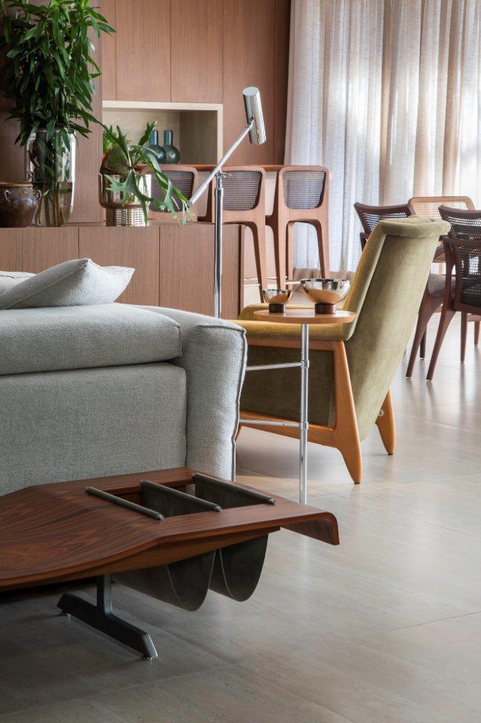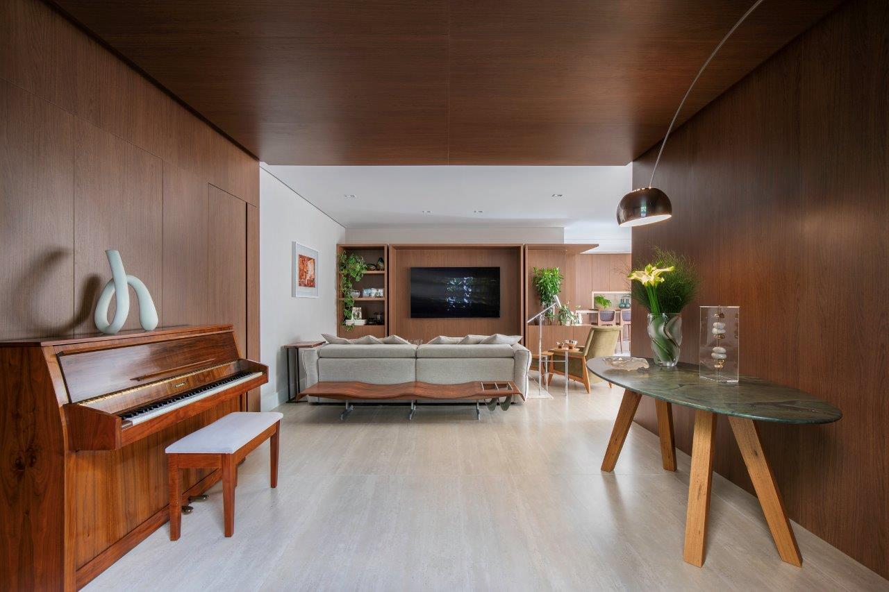 O hall de entrada traduz a identidade do projeto: madeira desenhada pela arquiteta no teto, paredes e porta, combinada ao porcelanato travertino acetinado. No décor, a mesa Gelsomina, a luminária Arco e o banco Onda dialogam com o piano do acervo da família. No living, poltronas Tetê em tons de verde e a mesa Raiz reforçam o mix de texturas que aquece o ambiente. A obra “Pincel”, de Ianelli, presente da própria família do artista aos moradores, ganha destaque em caixa de acrílico.