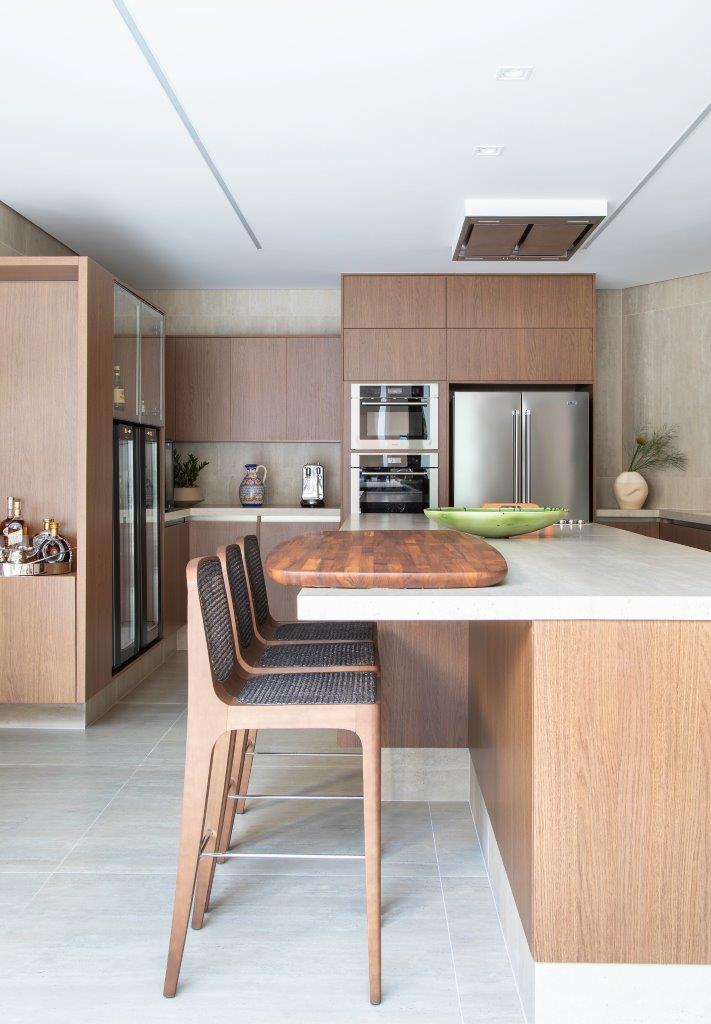 Na sala de jantar, um espelho de parede inteira expande o espaço e valoriza o conjunto de mesa e cadeiras Jader Almeida, sob o elegante pendente ELO, de Ana Neute. A cozinha, integrada à área social, recebeu soluções sob medida em marcenaria para acomodar todos os eletrodomésticos de forma discreta e harmônica, mantendo ergonomia e fluidez visual.