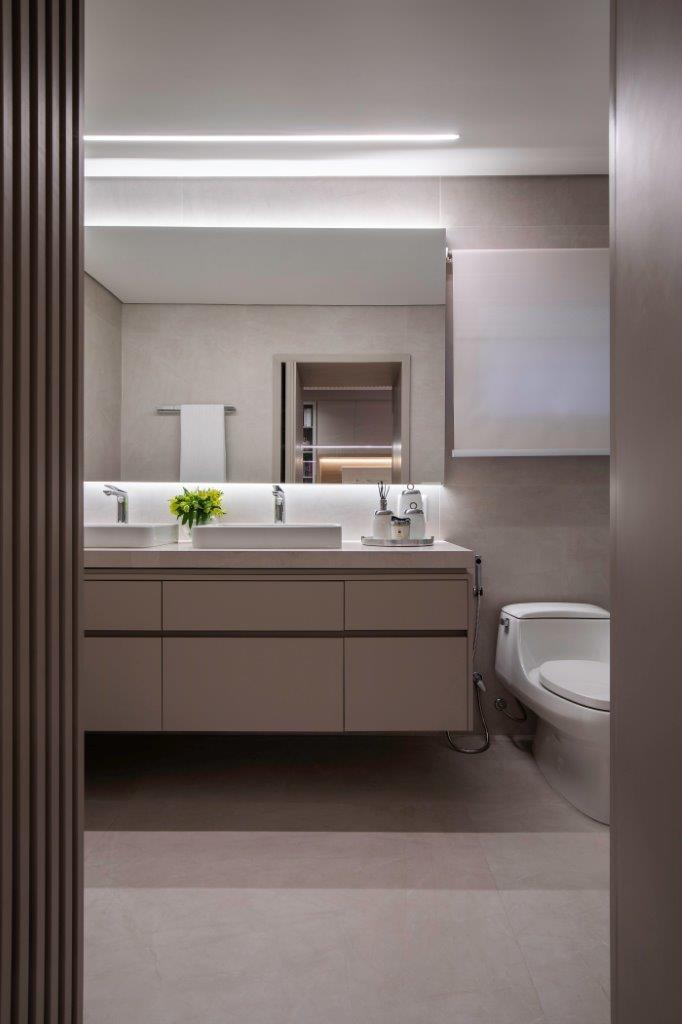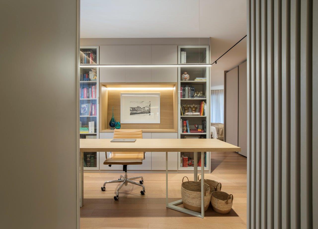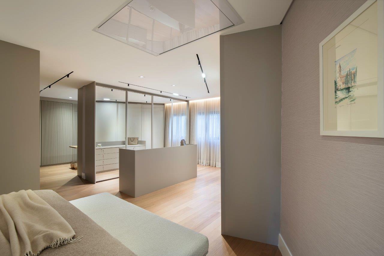 A suíte do casal privilegia descanso e suavidade, com cama super king, cabeceira em boucle e tapete de fibra natural. O closet, com portas de vidro serigrafado e ilha central, reforça o clima de hotel boutique. O escritório integrado, com mesa assinada por Samia e cadeira Herman Miller, cria um ambiente ideal para trabalho. O banheiro segue paleta neutra, com porcelanato contínuo e piso aquecido, que eleva o conforto e a sensação de spa.