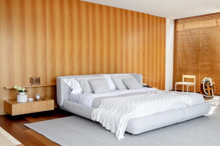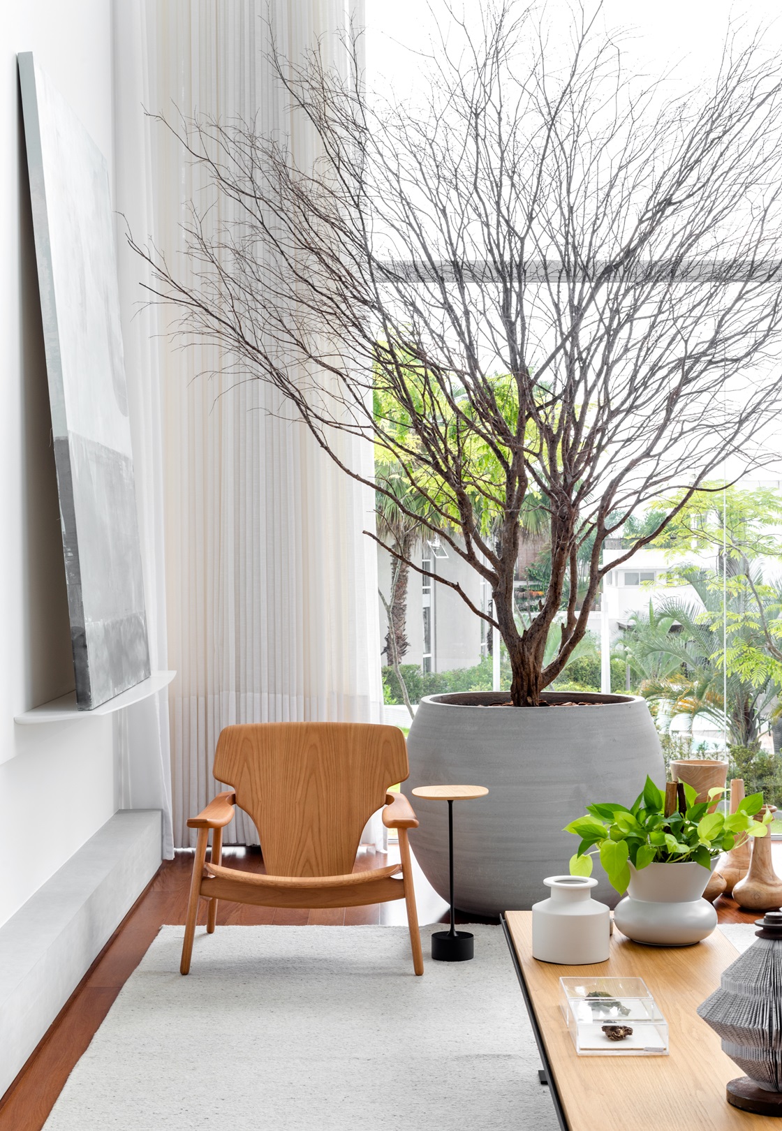 Uma das principais características da casa é a integração dos ambientes, proporcionando uma sensação de amplitude e fluidez. A madeira, material escolhido pelos proprietários, está presente em diversos elementos da decoração, conferindo um ar aconchegante e sofisticado. A grande protagonista do projeto, no entanto, é a oliveira de aproximadamente três metros de altura, que ocupa um lugar de destaque na sala principal, trazendo a beleza da natureza para dentro do lar.