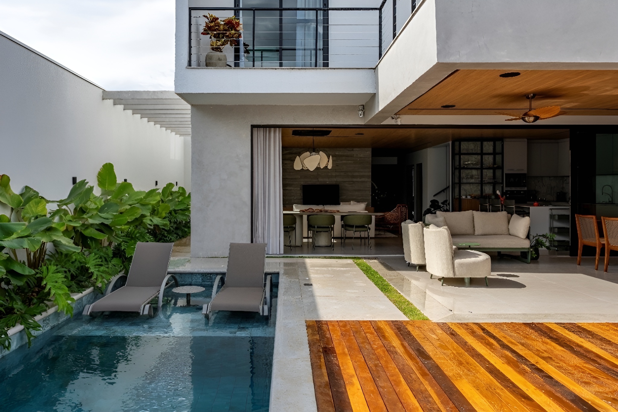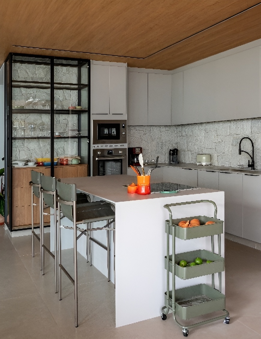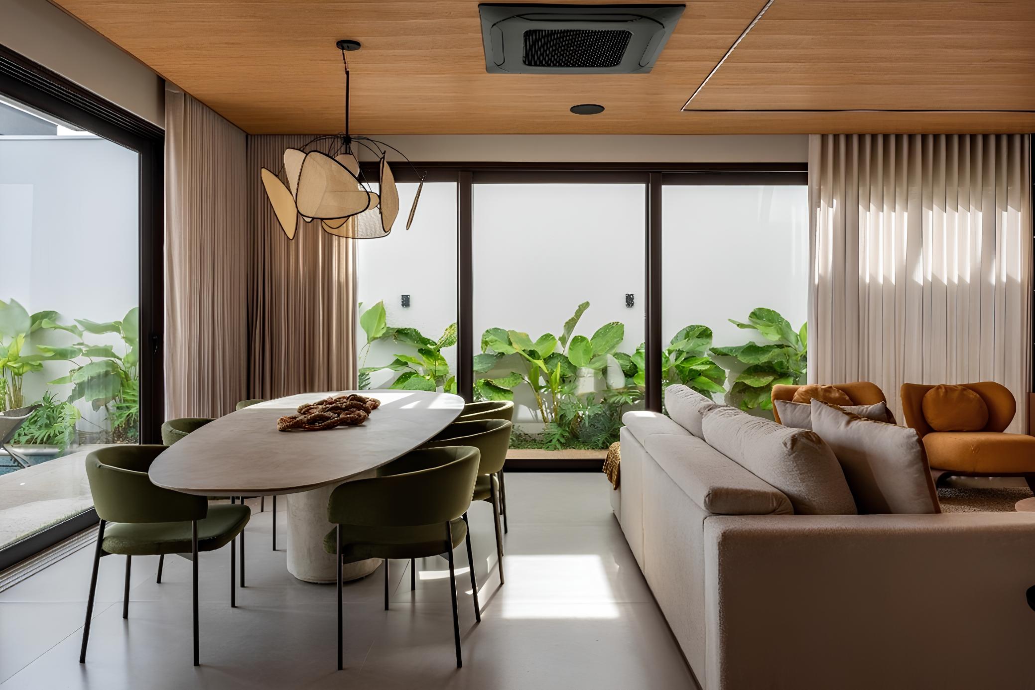 Segundo João Ayres, o teto desempenha papel fundamental na narrativa do projeto. “Na área social da residência, onde a vida acontece e os encontros se tornam memória, o teto não poderia ser apenas um acabamento; ele precisava ser um protagonista silencioso”, afirma o arquiteto. Nesse contexto, a escolha da Teto Vinílico foi essencial para alcançar precisão arquitetônica e refinamento estético, funcionando como uma moldura discreta que valoriza tanto a luz natural quanto o projeto luminotécnico noturno.