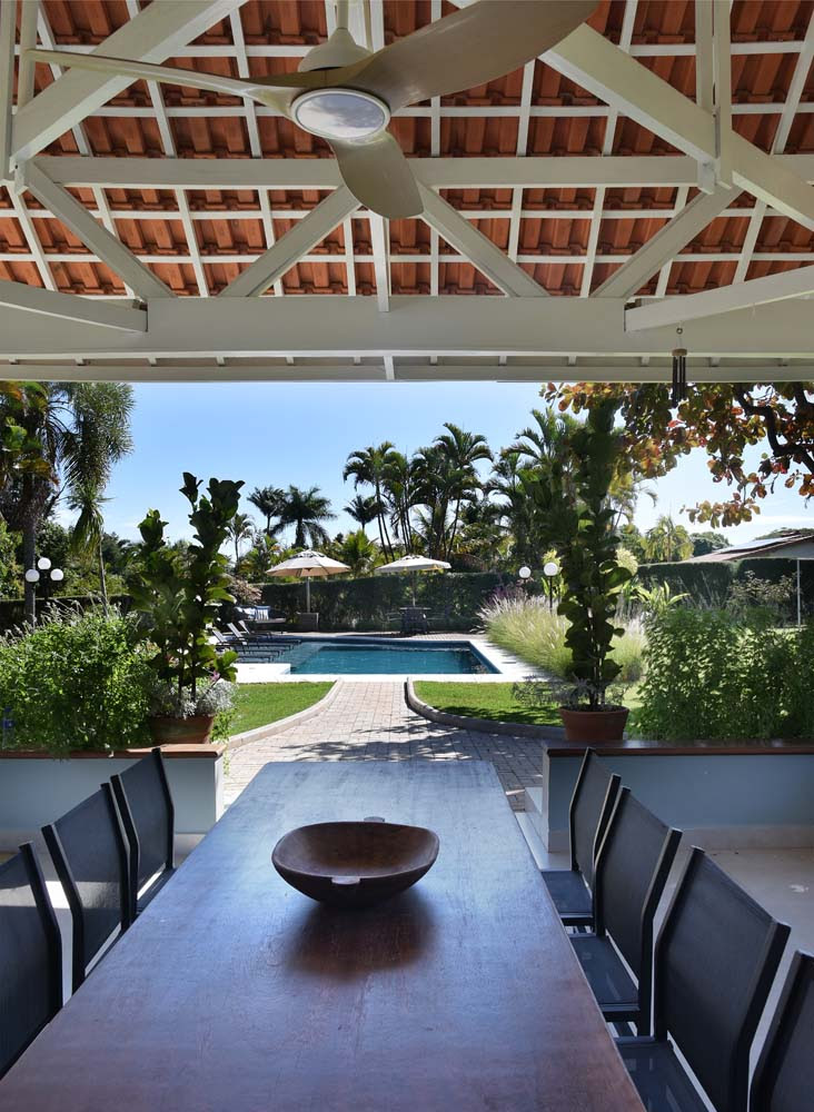 Na área gourmet reformada pela arquiteta Rosangela Pena, as laterais abertas e o telhado com telhas de barro propiciam iluminação natural e uma ventilação agradável, até mesmo nos dias mais quentes | Foto: Sidney Doll