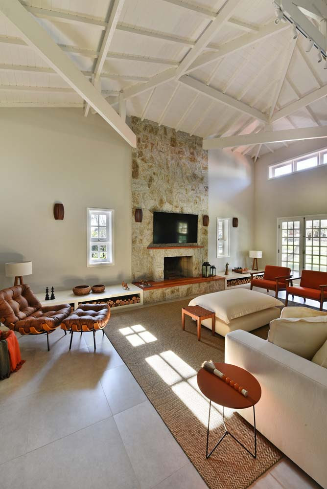O clima de campo conduz o décor da sala de estar que foi agraciado pelo pé-direito mais amplo e o charme das terças, caibros e ripas que formam o telhado | Projeto Rosangela Pena Arquitetura | Foto: Sidney Doll