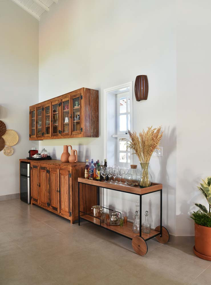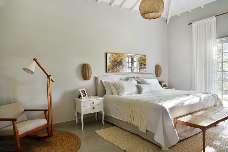 Nas referências implementadas no projeto de arquitetura de interiores, uma ampla variedade de elementos compostos por materiais naturais como a palha, bambu, madeira e barro marcam presença nas escolhas. Esse direcionamento também acompanhou a confecção das cortinas, almofadas e enxovais de cama, que tiveram o linho como elemento que deixam a casa ainda mais aconchegante. Mas além do décor, a profissional realizou a substituição dos revestimentos que já existiam, pintura e a redefinição dos mobiliários que foram compostos, majoritariamente, por peças soltas.