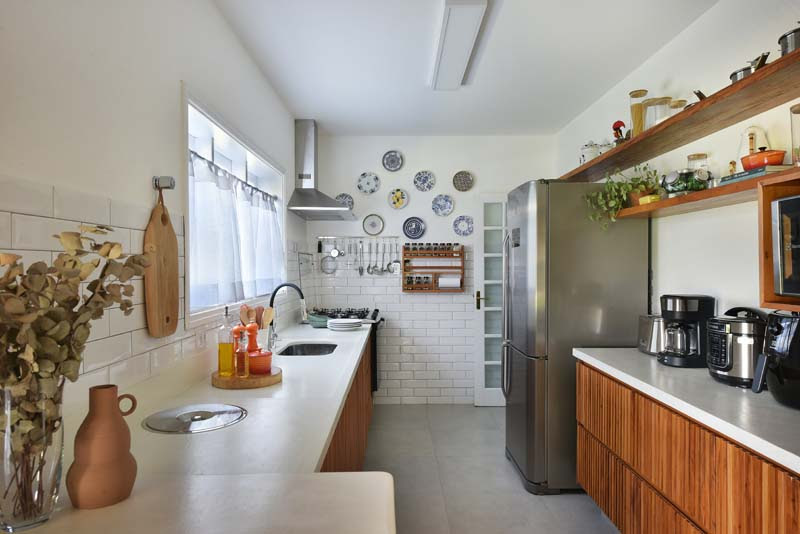 Muito bem explorada pela arquiteta Rosangela Pena, a cozinha tem um apelo afetivo e retrô com o revestimento subway tile e a coleção de pratos expostos na parede| Foto: Sidney Doll