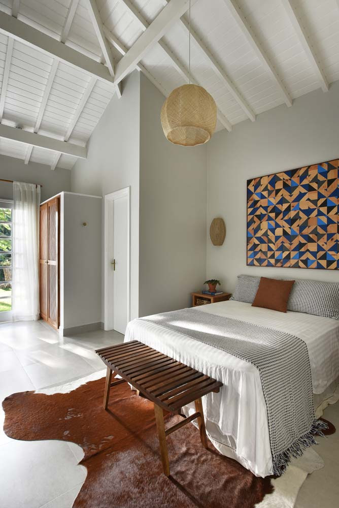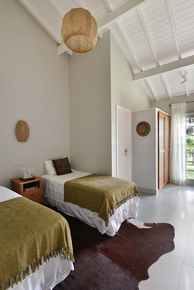 Para os hóspedes, a arquiteta Rosangela Pena acompanhou a proposta decorativa com elementos naturais, incluindo do clássico tapete de couro. Com camas de casal e solteiro, ambos também acessam a área externa por meio da esquadria de madeira e vidro. Sem a necessidade de grandes armários, cada quarto conta com o seu guarda-roupa confeccionado com a caixa em alvenaria e portas de madeira | Foto: Sidney Doll