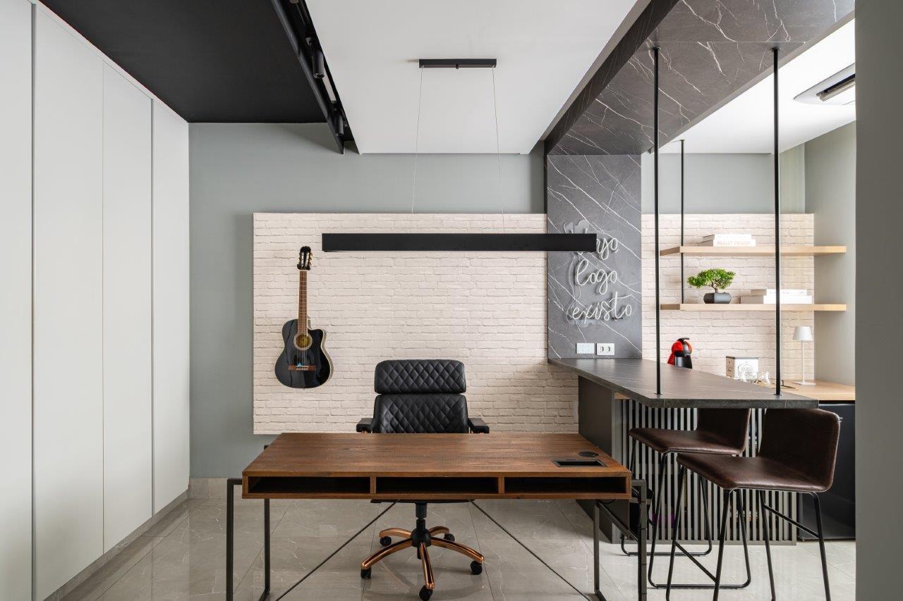 Uma particularidade interessante é a substituição do tradicional bar por um espaço dedicado ao café, alinhado ao estilo de vida abstêmio do casal e posicionado estrategicamente próximo ao escritório. O resultado é um ambiente despojado, mas com forte identidade, impulsionada pelo uso de cores intensas, texturas marcantes e elementos decorativos escolhidos a dedo.
